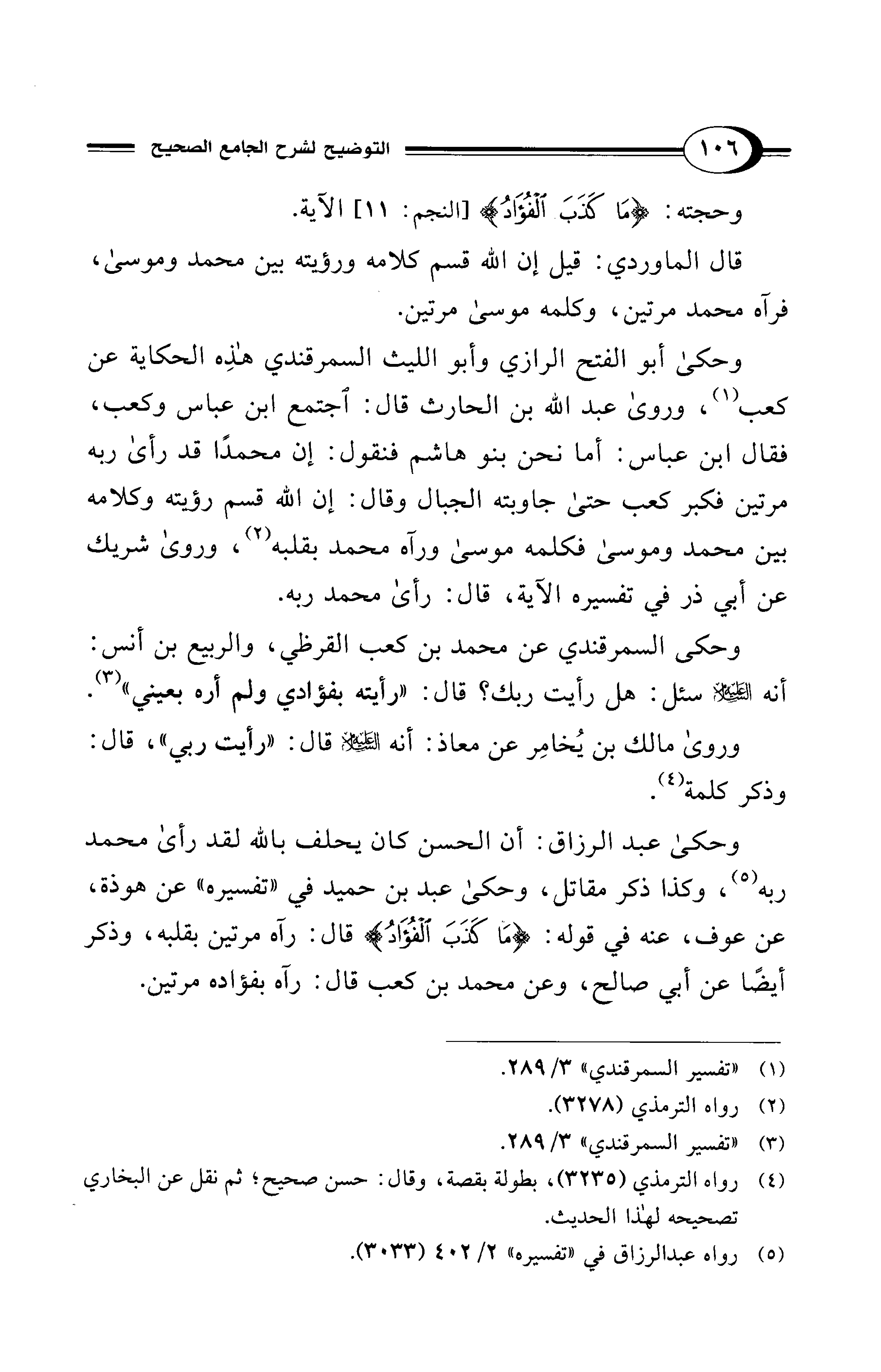 وحكى السمرقندي عن محمد بن كعب القرظي، والربيع بن أنس: أنه - عليه السلام - سئل: هل رأيت ربك؟ قال: "رأيته بفؤادي ولم أره بعيني" (¬3).