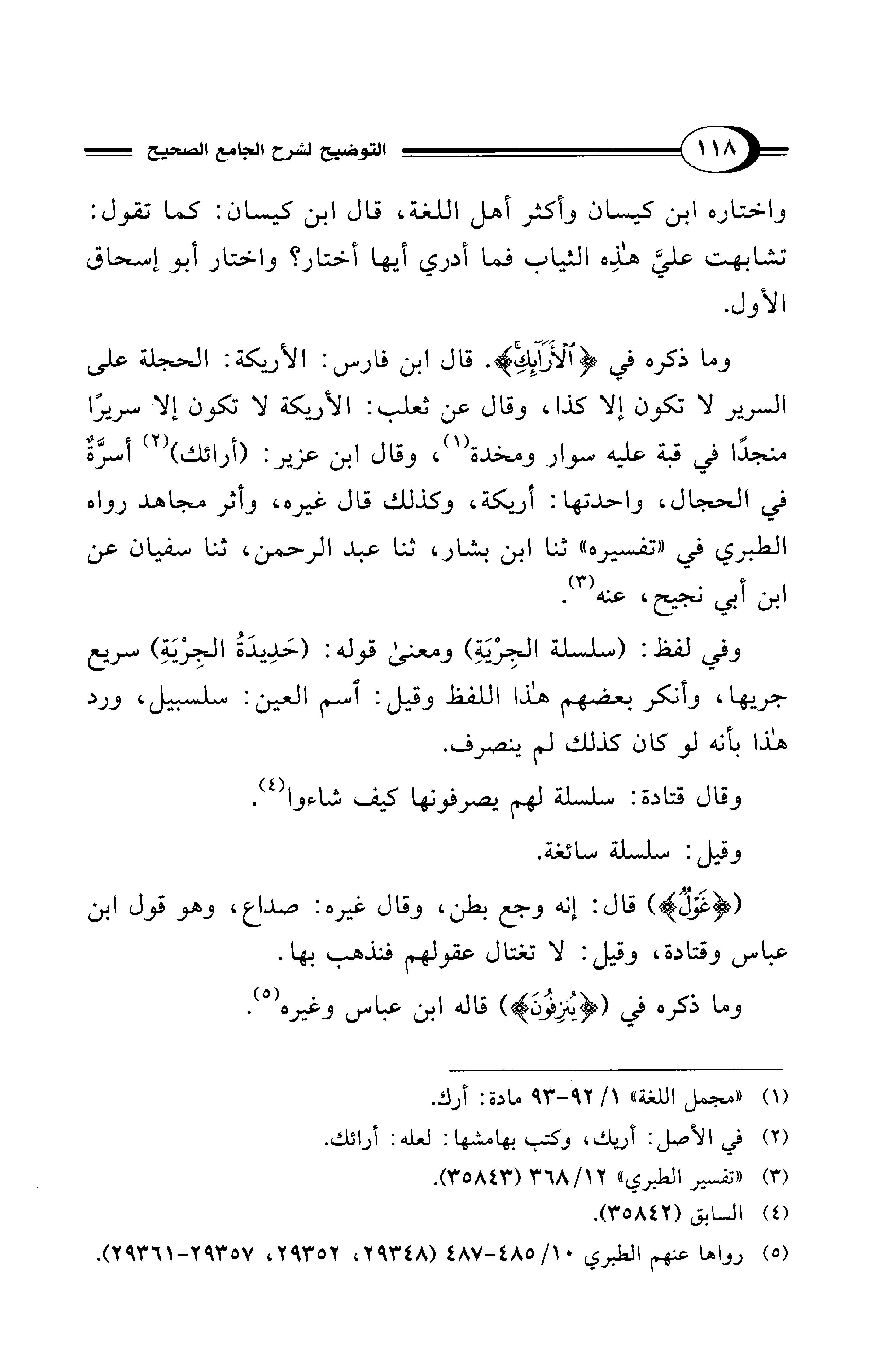 وما ذكره في {الْأَرَائِكِ}. قال ابن فارس: الأريكة: الحجلة على السرير لا تكون إلا كذا، وقال عن ثعلب: الأريكة لا تكون إلا سريرًا منجدًا في قبة عليه سوار ومخدة (¬1)، وقال ابن عزير: (أرائك) (¬2) أسرَّةٌ في الحجال، واحدتها: أريكة، وكذلك قال غيره، وأثر مجاهد رواه الطبري في "تفسيره" ثنا ابن بشار، ثنا عبد الرحمن، ثنا سفيان عن ابن أبي نجيح، عنه (¬3).