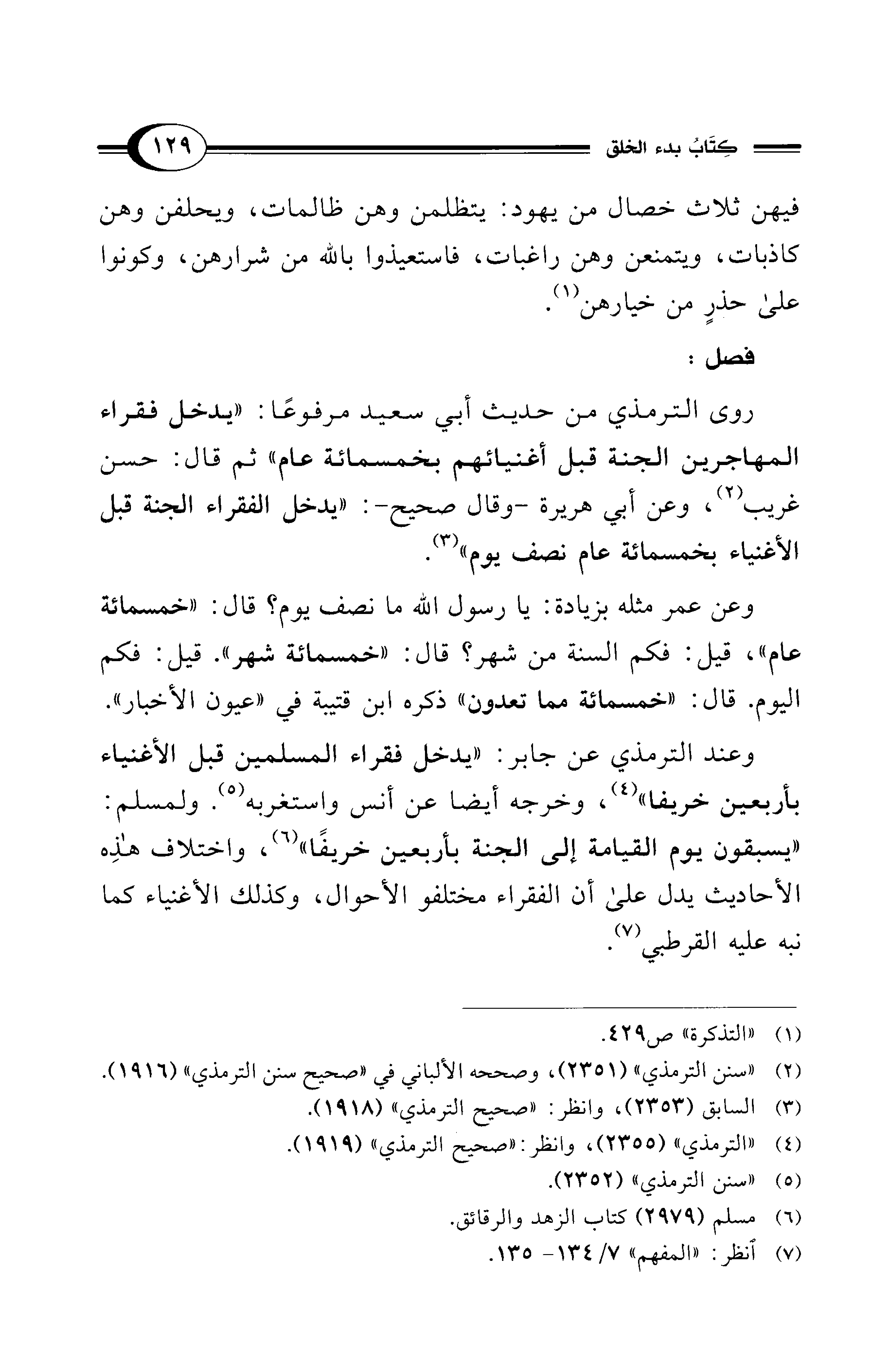 وعند الترمذي عن جابر: "يدخل فقراء المسلمين قبل الأغنياء بأربعين خريفا" (¬4)، وخرجه أيضًا عن أنس واستغربه (¬5). ولمسلم: "يسبقون يوم القيامة إلى الجنة بأربعين خريفًا" (¬6)، واختلاف هذِه الأحاديث يدل على أن الفقراء مختلفو الأحوال، وكذلك الأغنياء كما نبه عليه القرطبي (¬7).