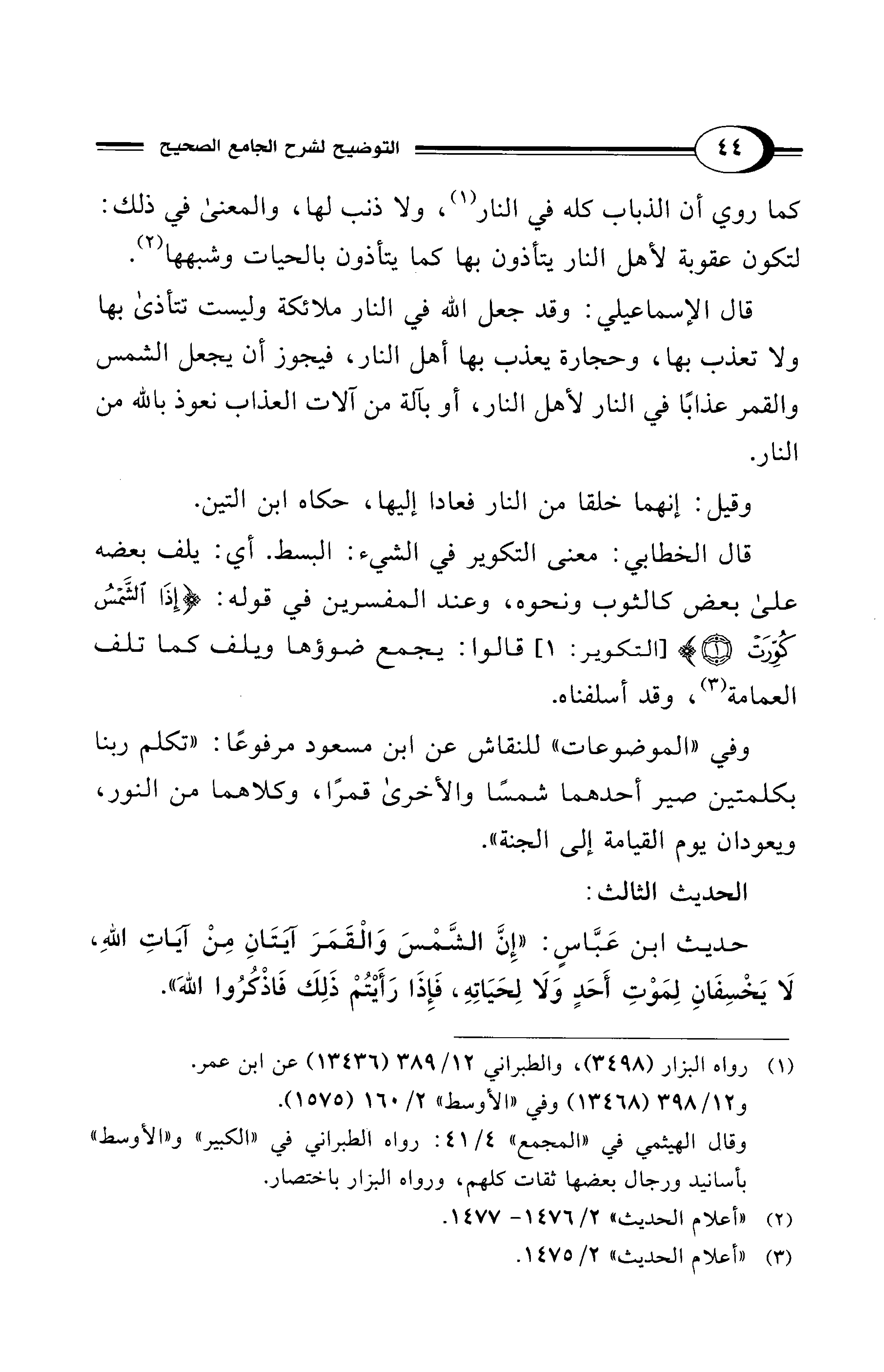 حديث ابن عَبَّاسٍ: "إِنَّ الشَّمْسَ وَالْقَمَرَ آيَتَانِ مِنْ آيَاتِ اللهِ، لَا يَخْسِفَانِ لِمَوْتِ أَحَدٍ وَلَا لِحَيَاتِهِ، فَإِذَا رَأَيْتُمْ ذَلِكَ فَاذْكُرُوا اللهَ".