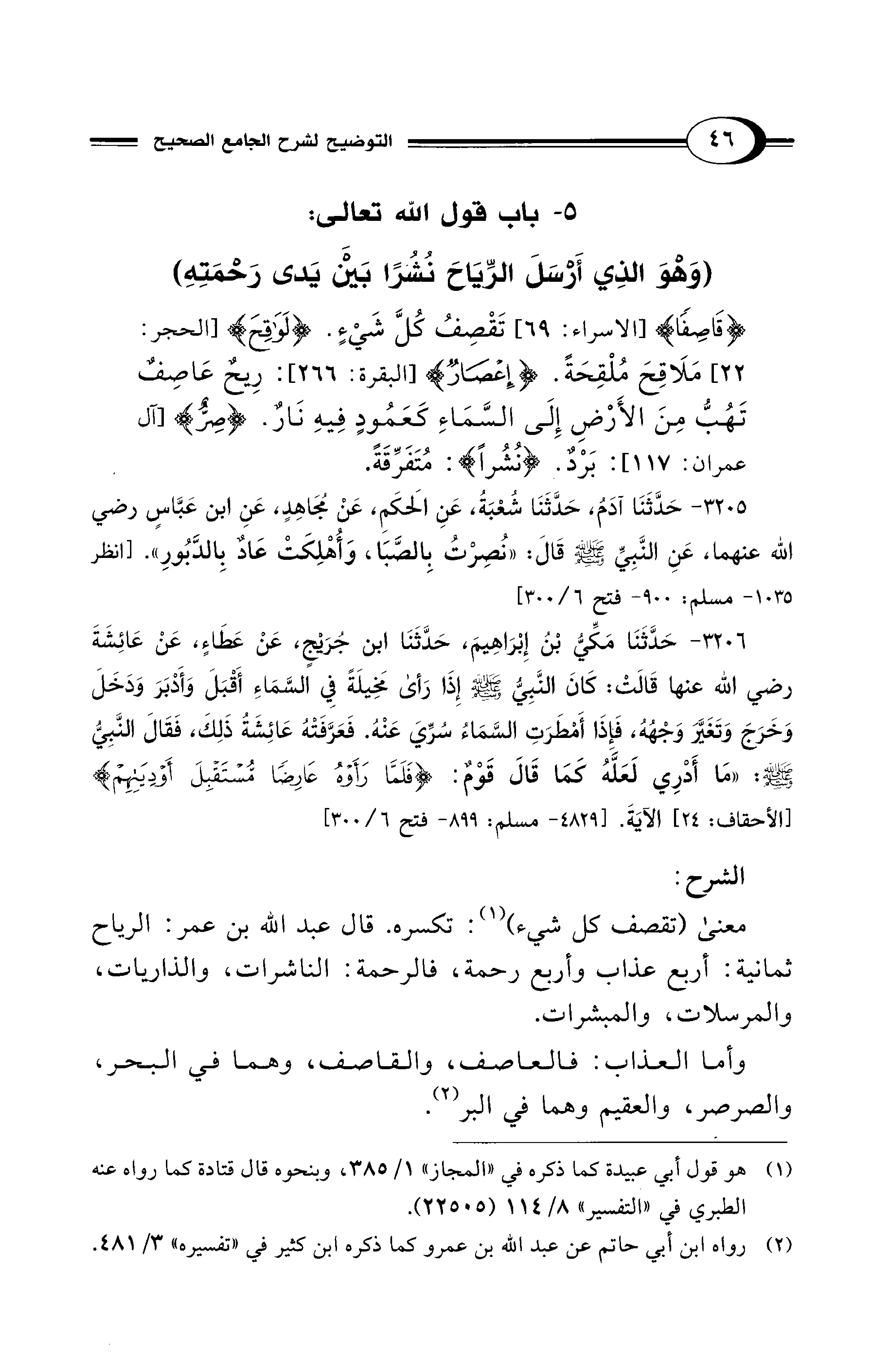 5 - باب قول الله تعالى: {وَهُوَ الَّذِي أَرْسَلَ الرِّيَاحَ بُشْرًا بَيْنَ يَدَيْ رَحْمَتِهِ}