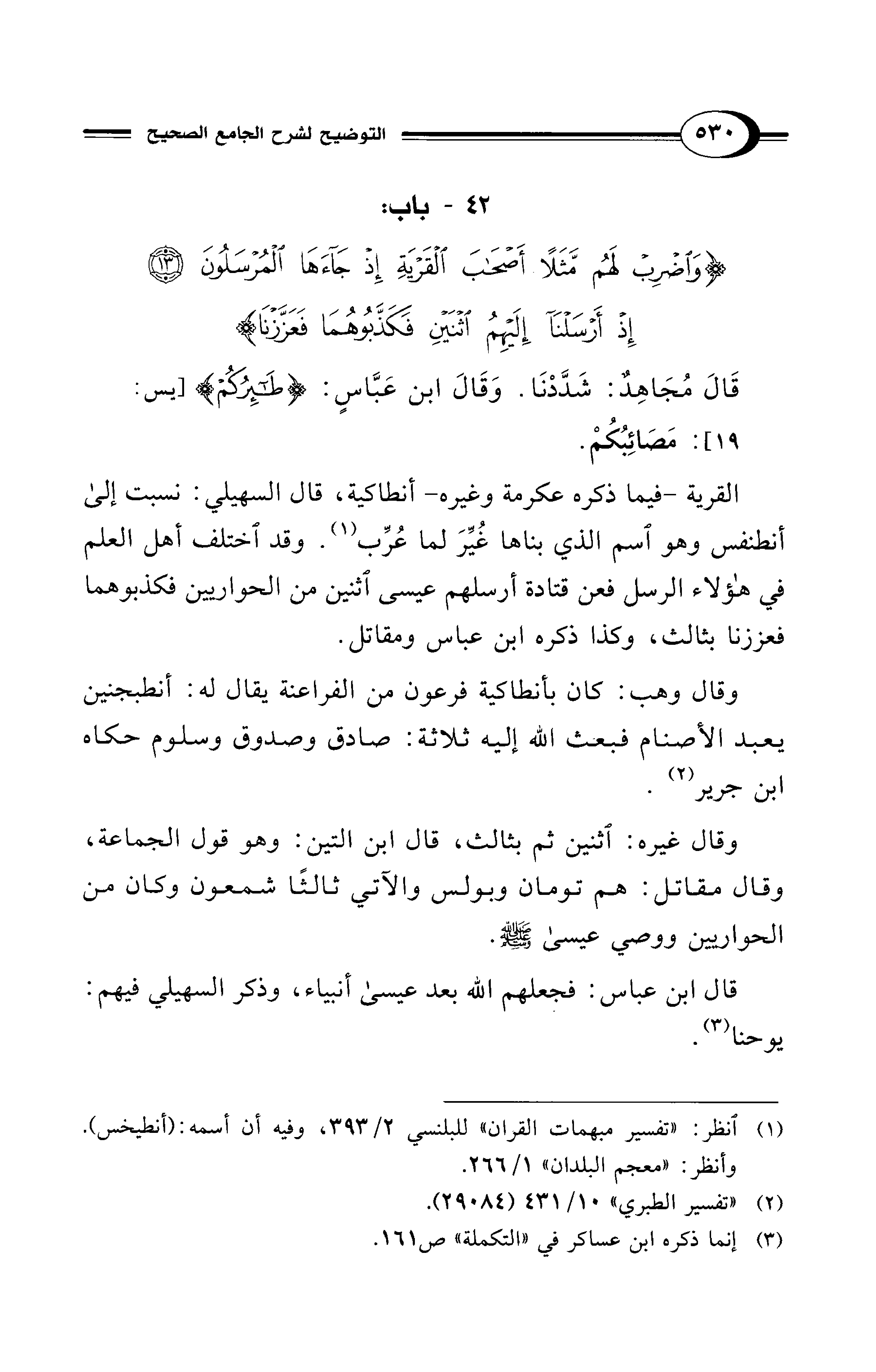 42 - باب: {وَاضْرِبْ لَهُمْ مَثَلًا أَصْحَابَ الْقَرْيَةِ إِذْ جَاءَهَا الْمُرْسَلُونَ (13) إِذْ أَرْسَلْنَا إِلَيْهِمُ اثْنَيْنِ فَكَذَّبُوهُمَا فَعَزَّزْنَا}