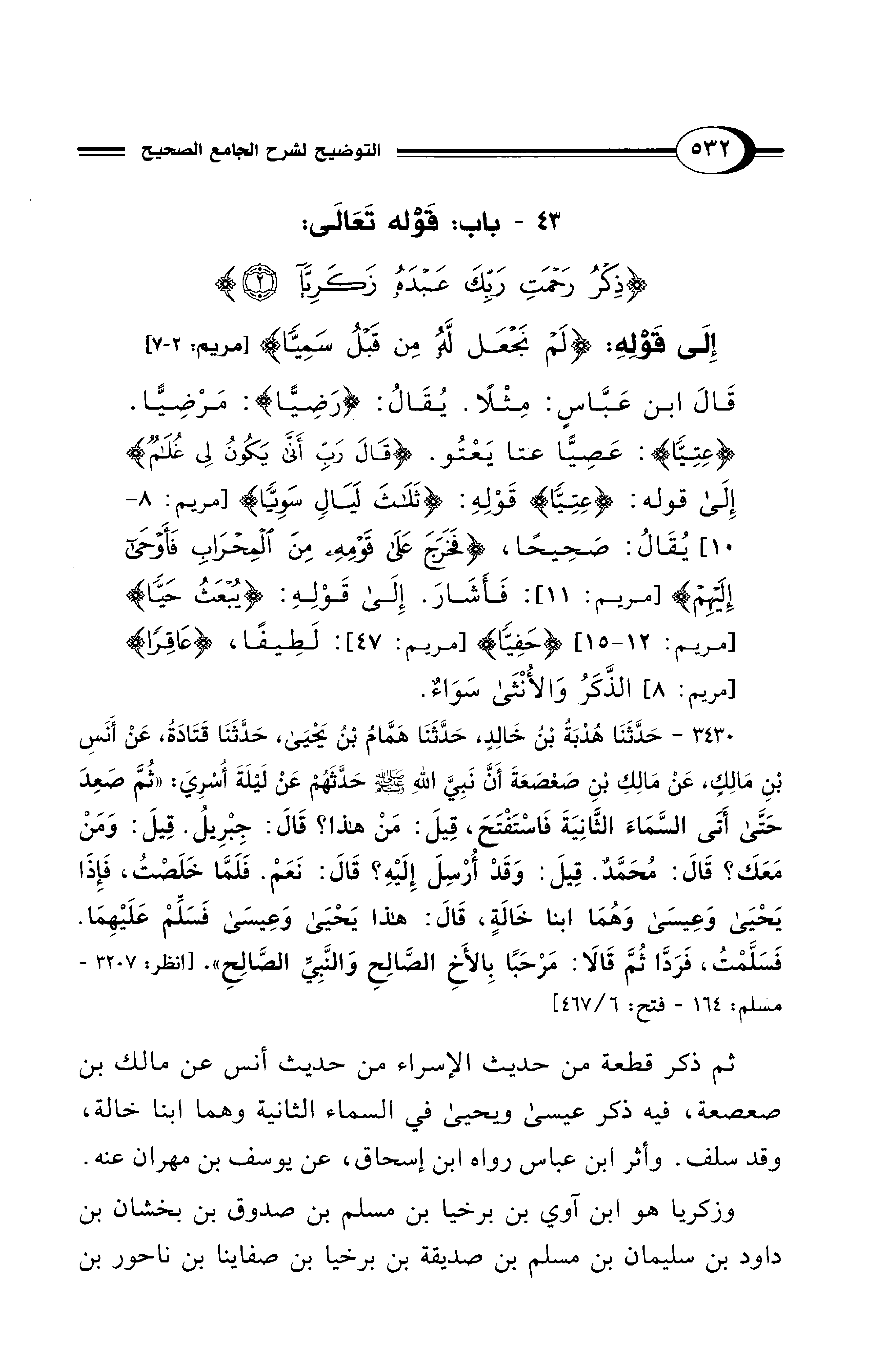 43 - باب قَوْلِ اللَّهِ تَعَالَى: {ذِكْرُ رَحْمَةِ رَبِّكَ عَبْدَهُ زَكَرِيَّاءَ (2)} إِلَى قَوْلِهِ: {لَمْ نَجْعَلْ لَهُ مِنْ قَبْلُ سَمِيًّا} [مريم: 2 - 7]