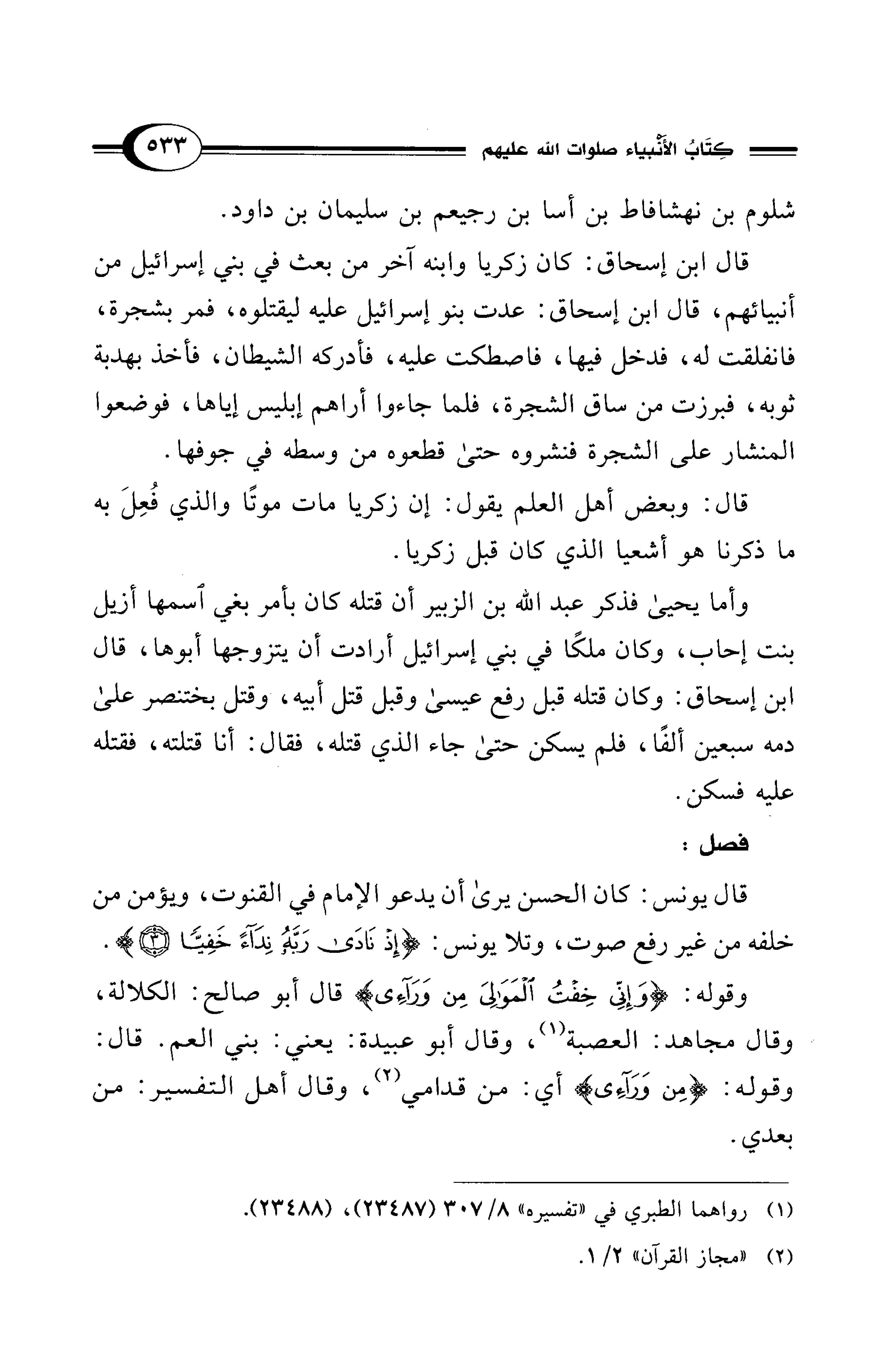 قال ابن إسحاق: كان زكريا وابنه آخر من بعث في بني إسرائيل من أنبيائهم، قال ابن إسحاق: عدت بنو إسرإئيل عليه ليقتلوه، فمر بشجرة، فانفلقت له، فدخل فيها، فاصطكت عليه، فأدركه الشيطان، فأخذ بهدبة ثوبه، فبرزت من ساق الشجرة، فلما جاءوا أراهم إبليس إياها، فوضعوا المنشار على الشجرة فنشروه حتى قطعوه من وسطه في جوفها.