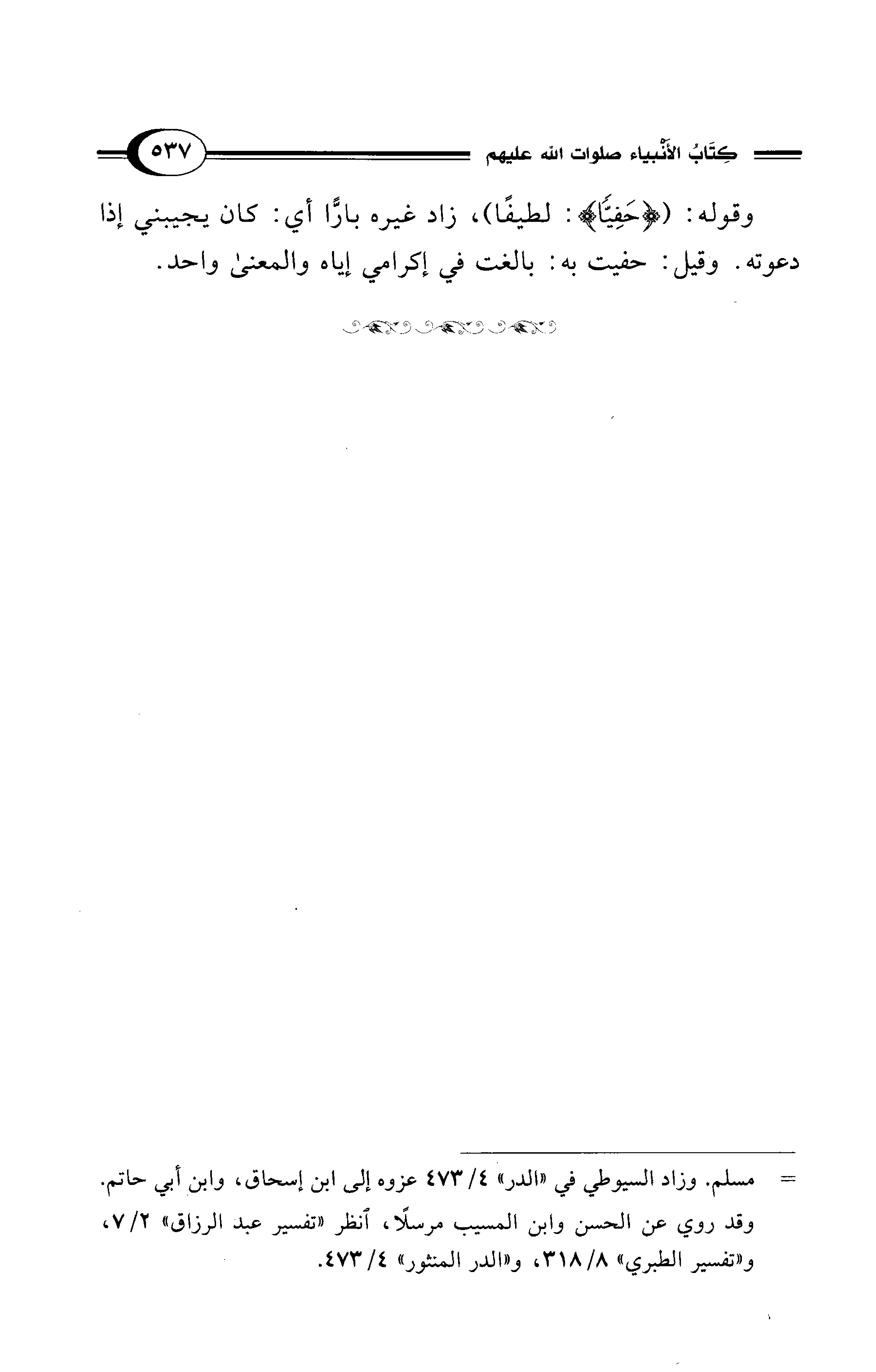 وقوله: ({حَفِيًّا}: لطيفًا)، زاد غيره بارًّا أي: كان يجيبني إذا دعوته. وقيل: حفيت به: بالغت في إكرامي إياه والمعنى واحد.
