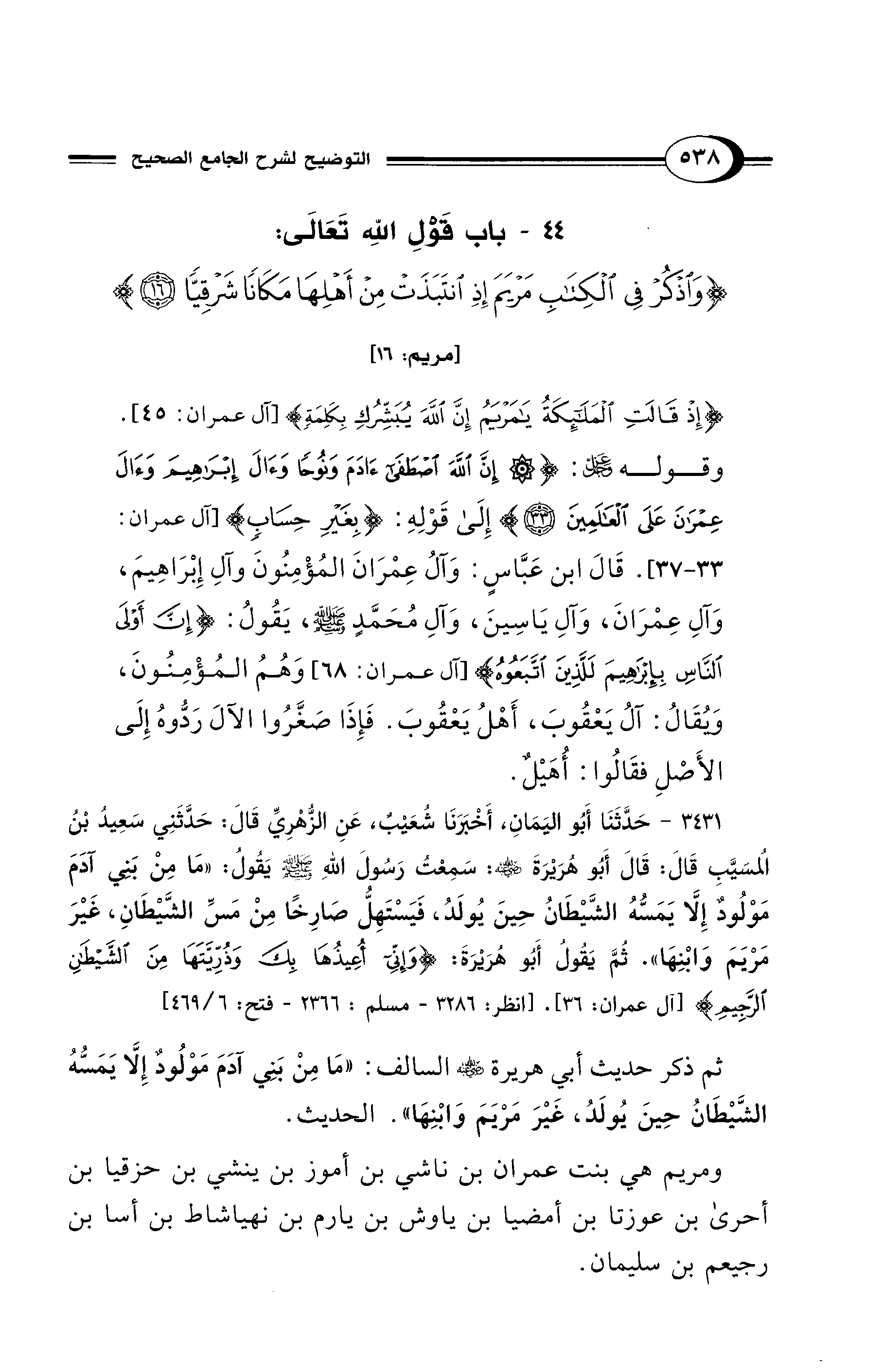 3431 - حَدَّثَنَا أَبُو اليَمَانِ, أَخْبَرَنَا شُعَيْبٌ, عَنِ الزُّهْرِىِّ قَالَ: حَدَّثَنِي سَعِيدُ بْنُ المُسَيَّبِ قَالَ: قَالَ أَبُو هُرَيْرَةَ - رضى الله عنه -: سَمِعْتُ رَسُولَ اللَّهِ - صلى الله عليه وسلم - يَقُولُ: «مَا مِنْ بَنِي آدَمَ مَوْلُودٌ إِلاَّ يَمَسُّهُ الشَّيْطَانُ حِينَ يُولَدُ، فَيَسْتَهِلُّ صَارِخًا مِنْ مَسِّ الشَّيْطَانِ، غَيْرَ مَرْيَمَ وَابْنِهَا». ثُمَّ يَقُولُ أَبُو هُرَيْرَةَ {وَإِنِّى أُعِيذُهَا بِكَ وَذُرِّيَّتَهَا مِنَ الشَّيْطَانِ الرَّجِيمِ} [آل عمران: 36] [انظر: 3286 - مسلم: 2366 - فتح: 6/ 469]