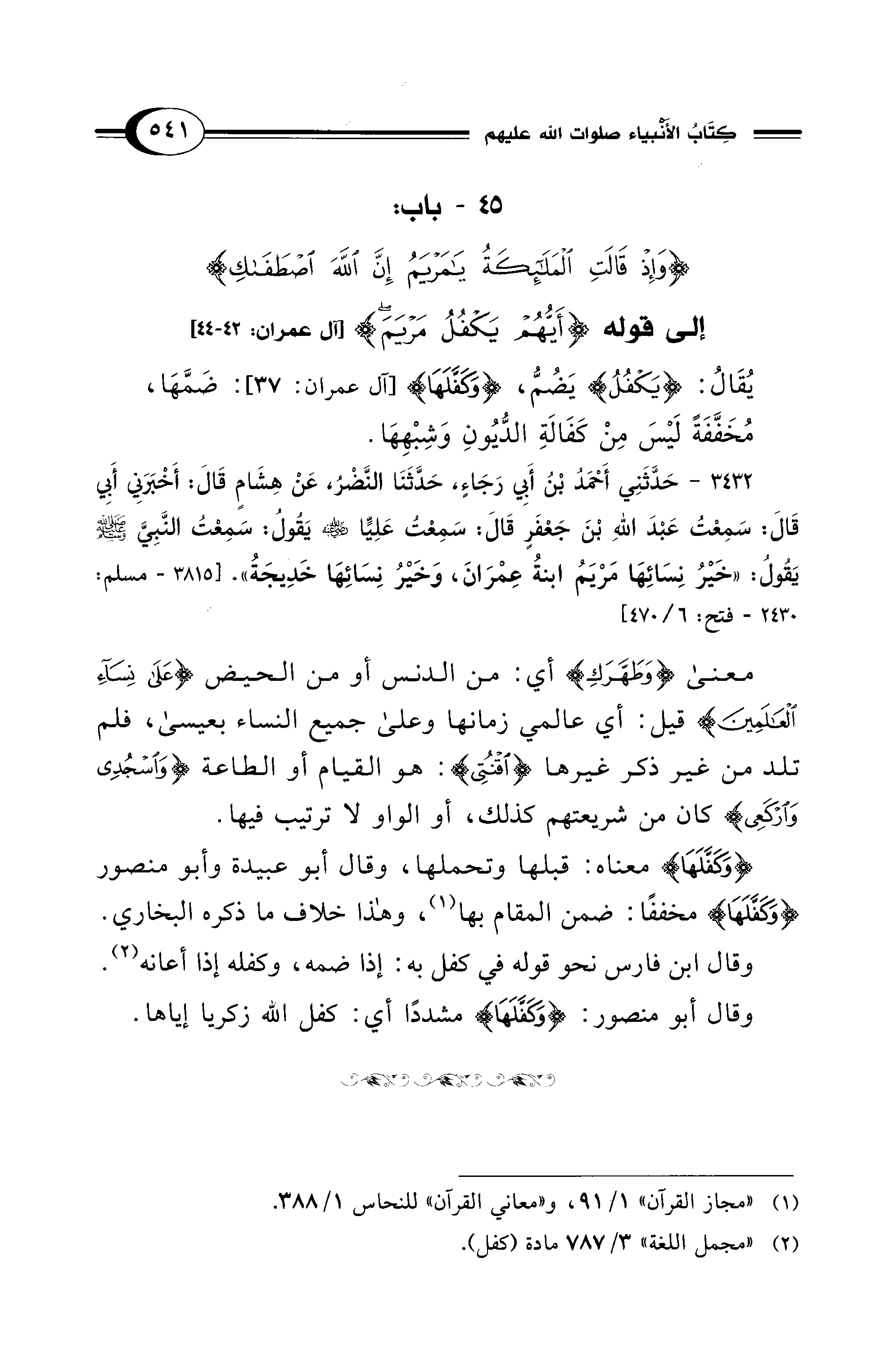 45 - باب: {وَإِذْ قَالَتِ الْمَلاَئِكَةُ يَا مَرْيَمُ إِنَّ اللَّهَ اصْطَفَاكِ} إلى قوله {أَيُّهُمْ يَكْفُلُ مَرْيَمَ} [آل عمران: 43 - 44]