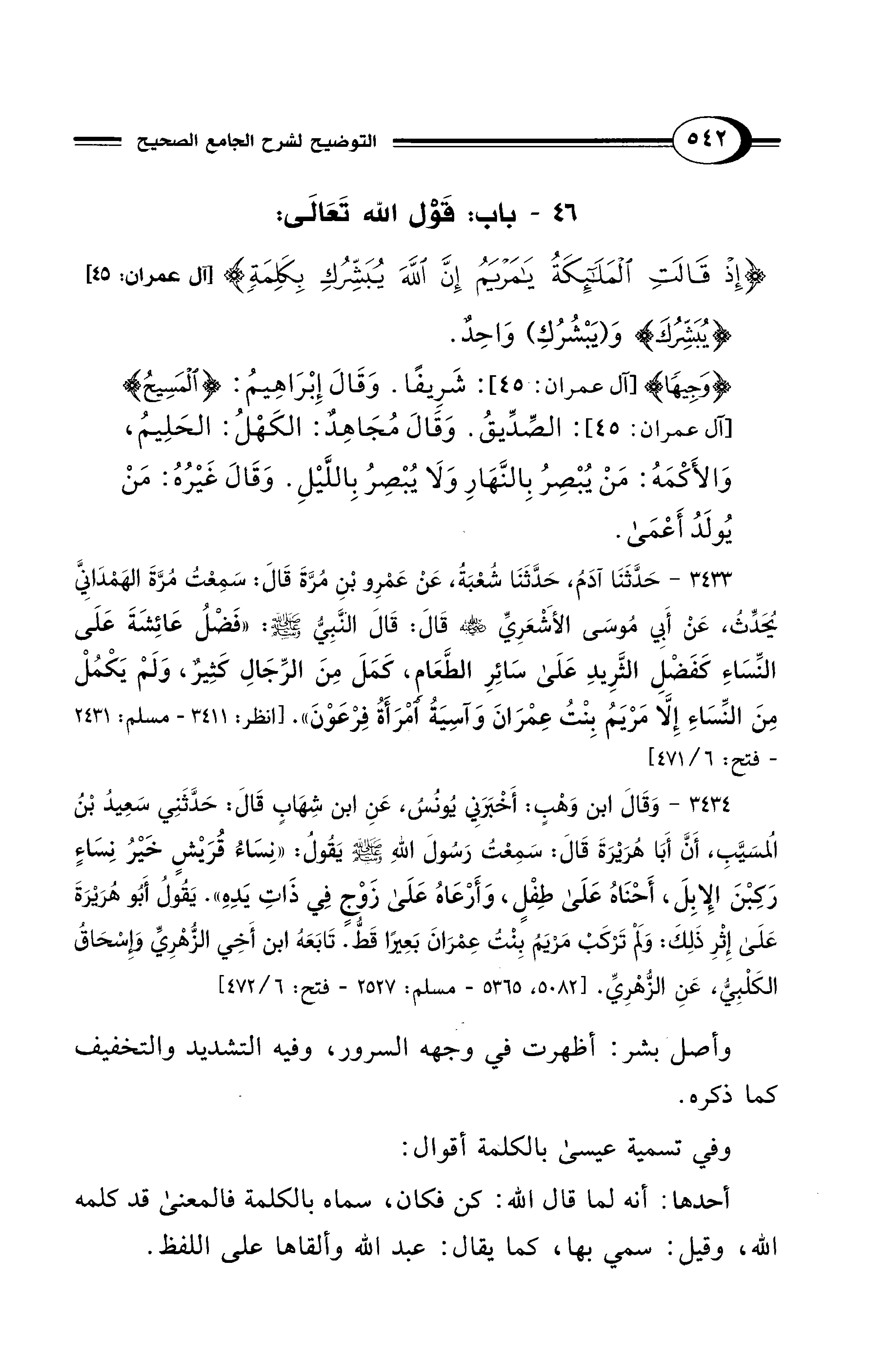 46 - باب قَوْلِهِ تَعَالَى: {إِذْ قَالَتِ الْمَلَائِكَةُ يَا مَرْيَمُ إِنَّ اللَّهَ يُبَشِّرُكِ بِكَلِمَةٍ} [آل عمران: 45]