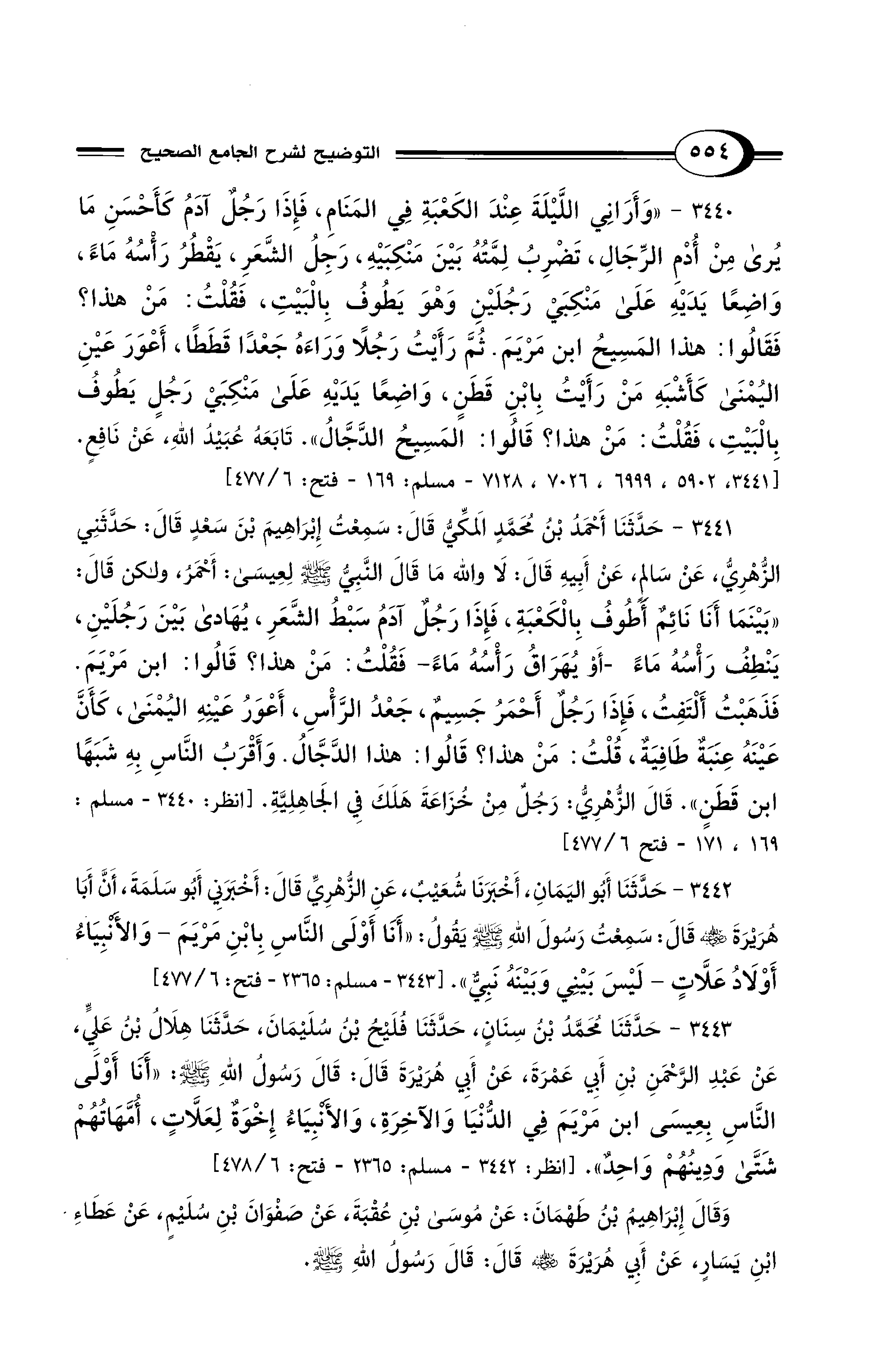 3440 - "وَأَرَانِي اللَّيْلَةَ عِنْدَ الكَعْبَةِ فِي المَنَامِ، فَإِذَا رَجُلٌ آدَمُ كَأَحْسَنِ مَا يُرَى مِنْ أُدْمِ الرِّجَالِ، تَضْرِبُ لِمَّتُهُ بَيْنَ مَنْكِبَيْهِ، رَجِلُ الشَّعَرِ، يَقْطُرُ رَأْسُهُ مَاءً، وَاضِعًا يَدَيْهِ عَلَى مَنْكِبَيْ رَجُلَيْنِ وَهْوَ يَطُوفُ بِالْبَيْتِ. فَقُلْتُ: مَنْ هَذَا؟ فَقَالُوا: هَذَا المَسِيحُ ابْنُ مَرْيَمَ. ثُمَّ رَأَيْتُ رَجُلاً وَرَاءَهُ جَعْدًا قَطَطًا, أَعْوَرَ عَيْنِ الْيُمْنَى كَأَشْبَهِ مَنْ رَأَيْتُ بِابْنِ قَطَنٍ، وَاضِعًا يَدَيْهِ عَلَى مَنْكِبَيْ رَجُلٍ، يَطُوفُ بِالْبَيْتِ، فَقُلْتُ: مَنْ هَذَا؟ قَالُوا: المَسِيحُ الدَّجَّالُ». تَابَعَهُ عُبَيْدُ اللهِ عَنْ نَافِعٍ. [3441, 5902, 6999, 7026, 7128 - مسلم: 169 - فتح: 6/ 477]