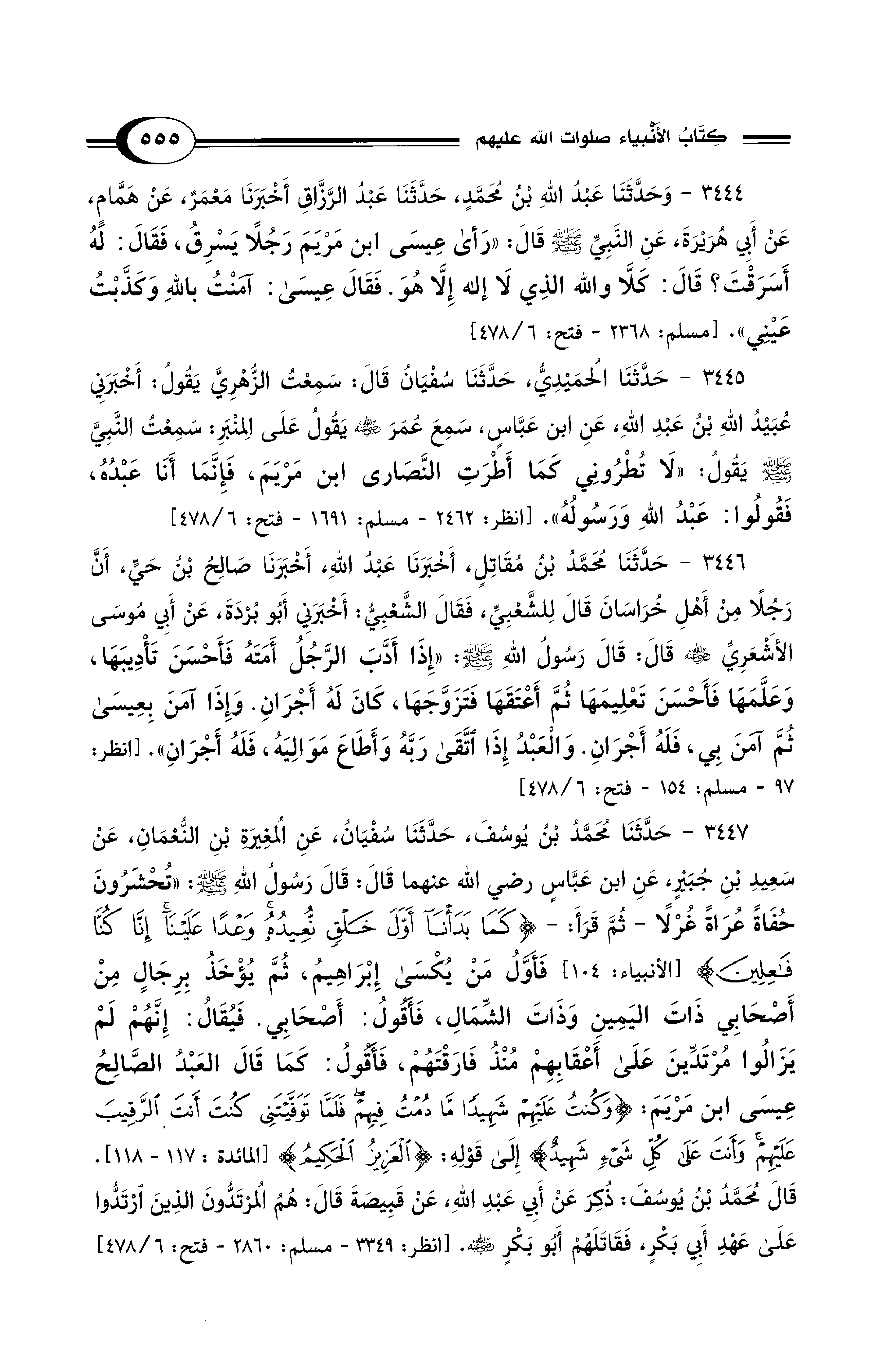 3447 - حَدَّثَنَا مُحَمَّدُ بْنُ يُوسُفَ, حَدَّثَنَا سُفْيَانُ, عَنِ المُغِيرَةِ بْنِ النُّعْمَانِ, عَنْ سَعِيدِ بْنِ جُبَيْرٍ, عَنِ ابْنِ عَبَّاسٍ - رضي الله عنهما - قَالَ: قَالَ رَسُولُ اللهِ - صلى الله عليه وسلم -: «تُحْشَرُونَ حُفَاةً عُرَاةً غُرْلاً -ثُمَّ قَرَأَ:- {كَمَا بَدَأْنَا أَوَّلَ خَلْقٍ نُعِيدُهُ وَعْدًا عَلَيْنَا إِنَّا كُنَّا فَاعِلِينَ} [الأنبياء: 104] فَأَوَّلُ مَنْ يُكْسَى إِبْرَاهِيمُ، ثُمَّ يُؤْخَذُ بِرِجَالٍ مِنْ أَصْحَابِي ذَاتَ اليَمِينِ وَذَاتَ الشِّمَالِ, فَأَقُولُ: أَصْحَابِي فَيُقَالُ: إِنَّهُمْ لَمْ يَزَالُوا مُرْتَدِّينَ عَلَى أَعْقَابِهِمْ مُنْذُ فَارَقْتَهُمْ، فَأَقُولُ: كَمَا قَالَ الْعَبْدُ الصَّالِحُ عِيسَى ابْنُ مَرْيَمَ: {وَكُنْتُ عَلَيْهِمْ شَهِيدًا مَا دُمْتُ فِيهِمْ فَلَمَّا تَوَفَّيْتَنِي كُنْتَ أَنْتَ الرَّقِيبَ عَلَيْهِمْ وَأَنْتَ عَلَى كُلِّ شَيْءٍ شَهِيدٌ} إِلَى قَوْلِهِ {الْعَزِيزُ الْحَكِيمُ} [المائدة: 117 - 118]. قَالَ مُحَمَّدُ بْنُ يُوسُفَ: ذُكِرَ عَنْ أَبِي عَبْدِ اللهِ, عَنْ قَبِيصَةَ قَالَ: هُمُ الْمُرْتَدُّونَ الَّذِينَ ارْتَدُّوا عَلَى عَهْدِ أَبِى بَكْرٍ، فَقَاتَلَهُمْ أَبُو بَكْرٍ - رضي الله عنه -. [انظر: 3349 - مسلم: 2860 - فتح: 6/ 478]