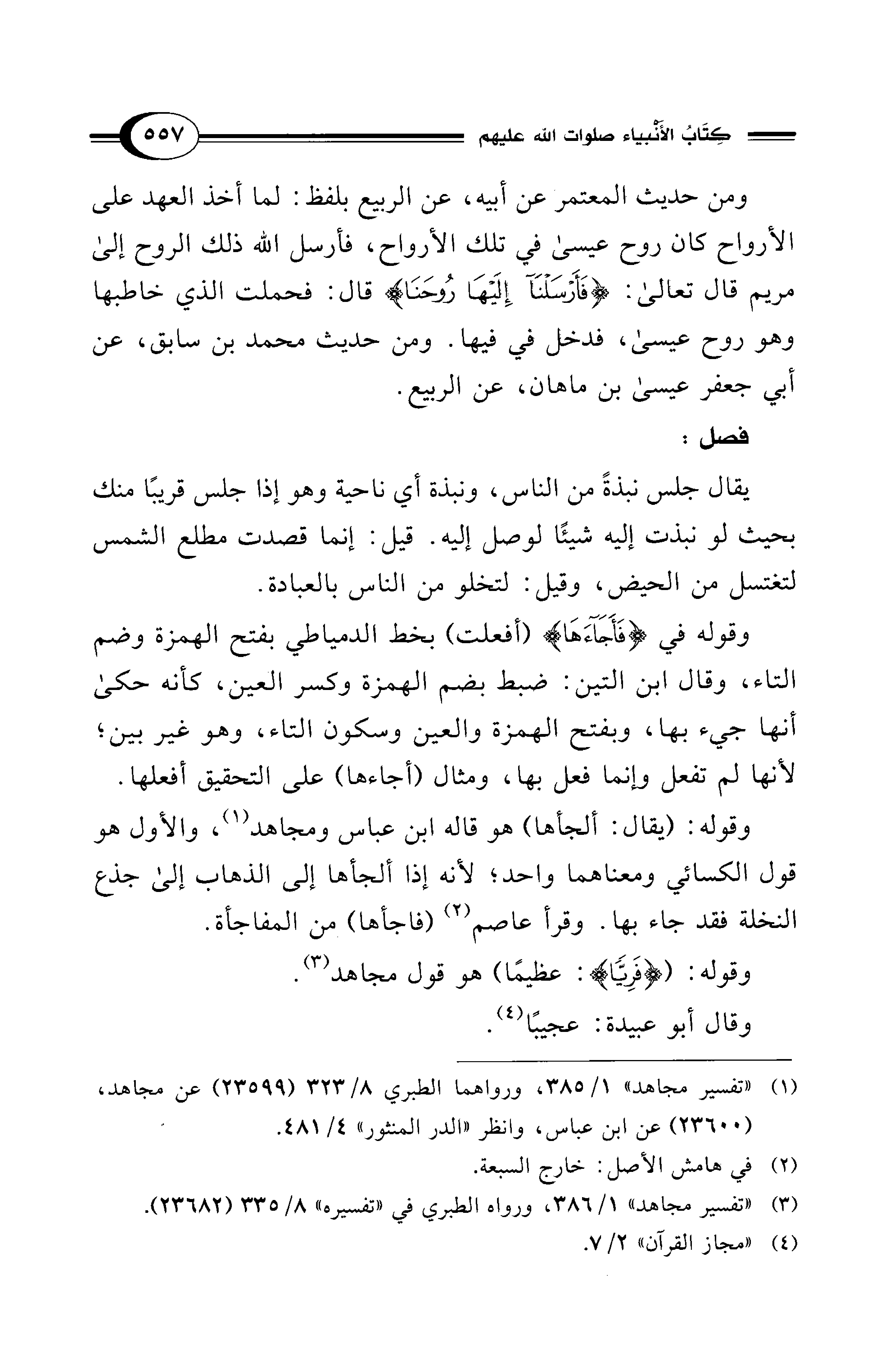ومن حديث المعتمر عن أبيه، عن الربيع بلفظ: لما أخذ العهد على الأرواح كان روح عيسى في تلك الأرواح، فأرسل الله ذلك الروح إلى مريم قال تعالى: {فَأَرْسَلْنَا إِلَيْهَا رُوحَنَا} قال: فحملت الذي خاطبها وهو روح عيسى، فدخل في فيها. ومن حديث محمد بن سابق، عن أبي جعفر عيسى بن ماهان، عن الربيع.