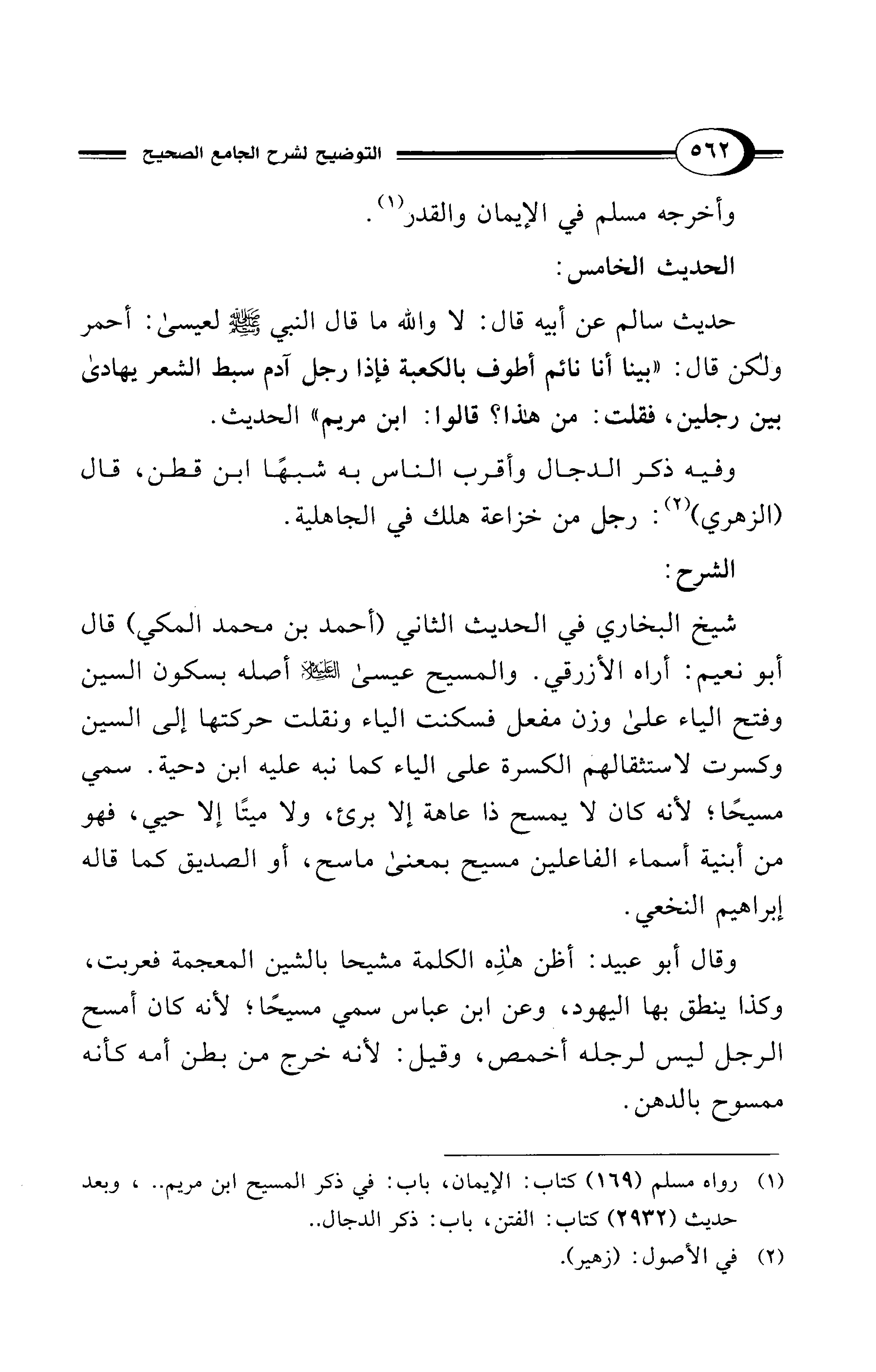 شيخ البخاري في الحديث الثاني (أحمد بن محمد المكي) قال أبو نعيم: أراه الأزرقي. والمسيح عيسى - عليه السلام - أصله بسكون السين وفتح الياء على وزن مفعل فسكنت الياء ونقلت حركتها إلى السين وكسرت لاستثقالهم الكسرة على الياء كما نبه عليه ابن دحية. سمي مسيحًا؛ لأنه كان لا يمسح ذا عاهة إلا برئ، ولا ميتًا إلا حيي، فهو من أبنية أسماء الفاعلين مسيح بمعنى ماسح، أو الصديق كما قاله إبراهيم النخعي.
