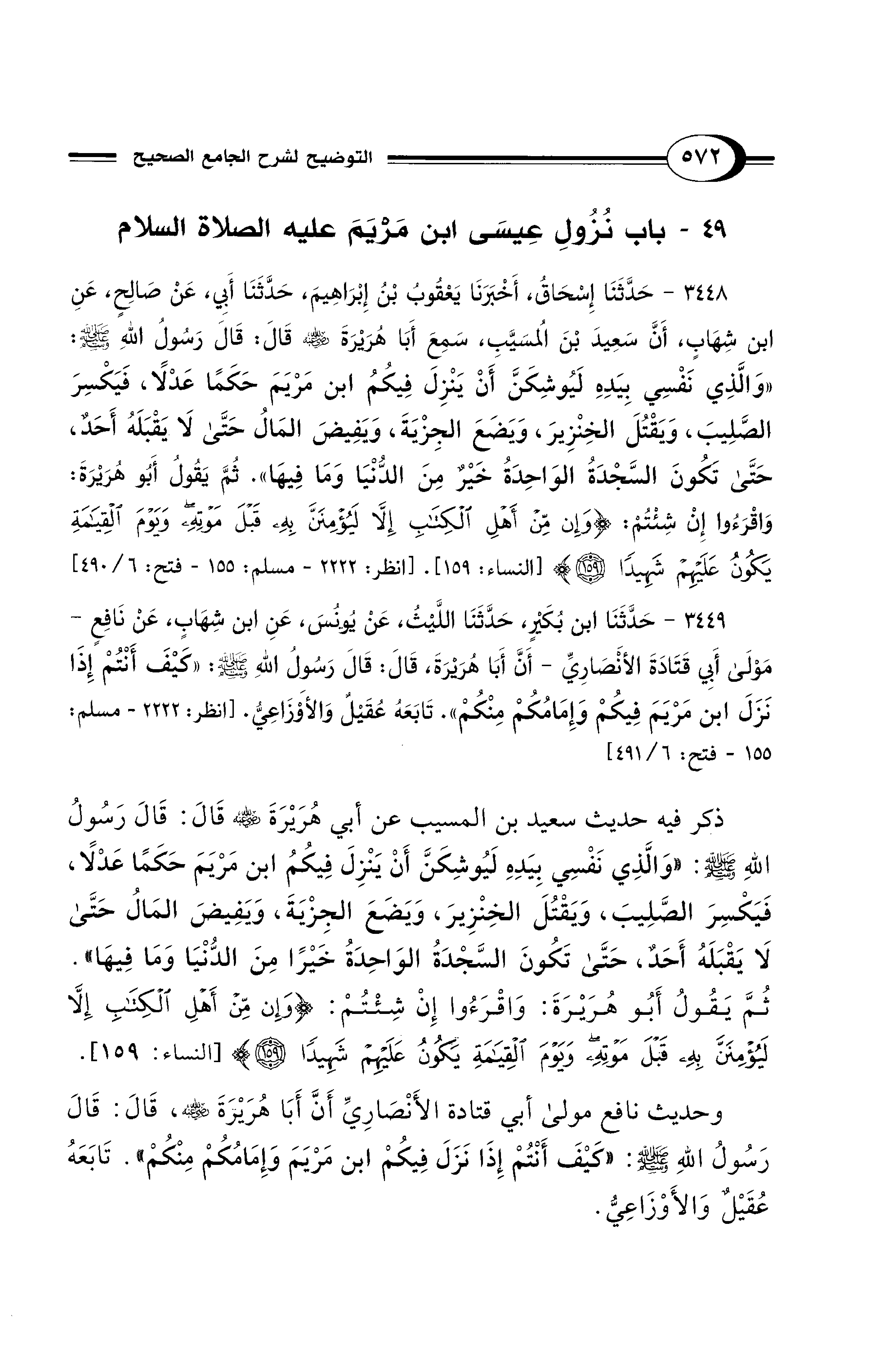 3448 - حَدَّثَنَا إِسْحَاقُ, أَخْبَرَنَا يَعْقُوبُ بْنُ إِبْرَاهِيمَ, حَدَّثَنَا أَبِي, عَنْ صَالِحٍ, عَنِ ابْنِ شِهَابٍ, أَنَّ سَعِيدَ بْنَ المُسَيَّبِ, سَمِعَ أَبَا هُرَيْرَةَ - رضي الله عنه - قَالَ: قَالَ رَسُولُ اللهِ - صلى الله عليه وسلم -: «وَالَّذِي نَفْسِي بِيَدِهِ، لَيُوشِكَنَّ أَنْ يَنْزِلَ فِيكُمُ ابْنُ مَرْيَمَ حَكَمًا عَدْلاً، فَيَكْسِرَ الصَّلِيبَ، وَيَقْتُلَ الخِنْزِيرَ، وَيَضَعَ الجِزْيَةَ، وَيَفِيضَ الْمَالُ حَتَّى لاَ يَقْبَلَهُ أَحَدٌ، حَتَّى تَكُونَ السَّجْدَةُ الوَاحِدَةُ خَيْرًا مِنَ الدُّنْيَا وَمَا فِيهَا». ثُمَّ يَقُولُ أَبُو هُرَيْرَةَ: وَاقْرَءُوا إِنْ شِئْتُمْ: {وَإِنْ مِنْ أَهْلِ الْكِتَابِ إِلَّا لَيُؤْمِنَنَّ بِهِ قَبْلَ مَوْتِهِ وَيَوْمَ الْقِيَامَةِ يَكُونُ عَلَيْهِمْ شَهِيدًا (159)} [النساء: 159]. [انظر: 2222 - مسلم: 155 - فتح: 6/ 490]