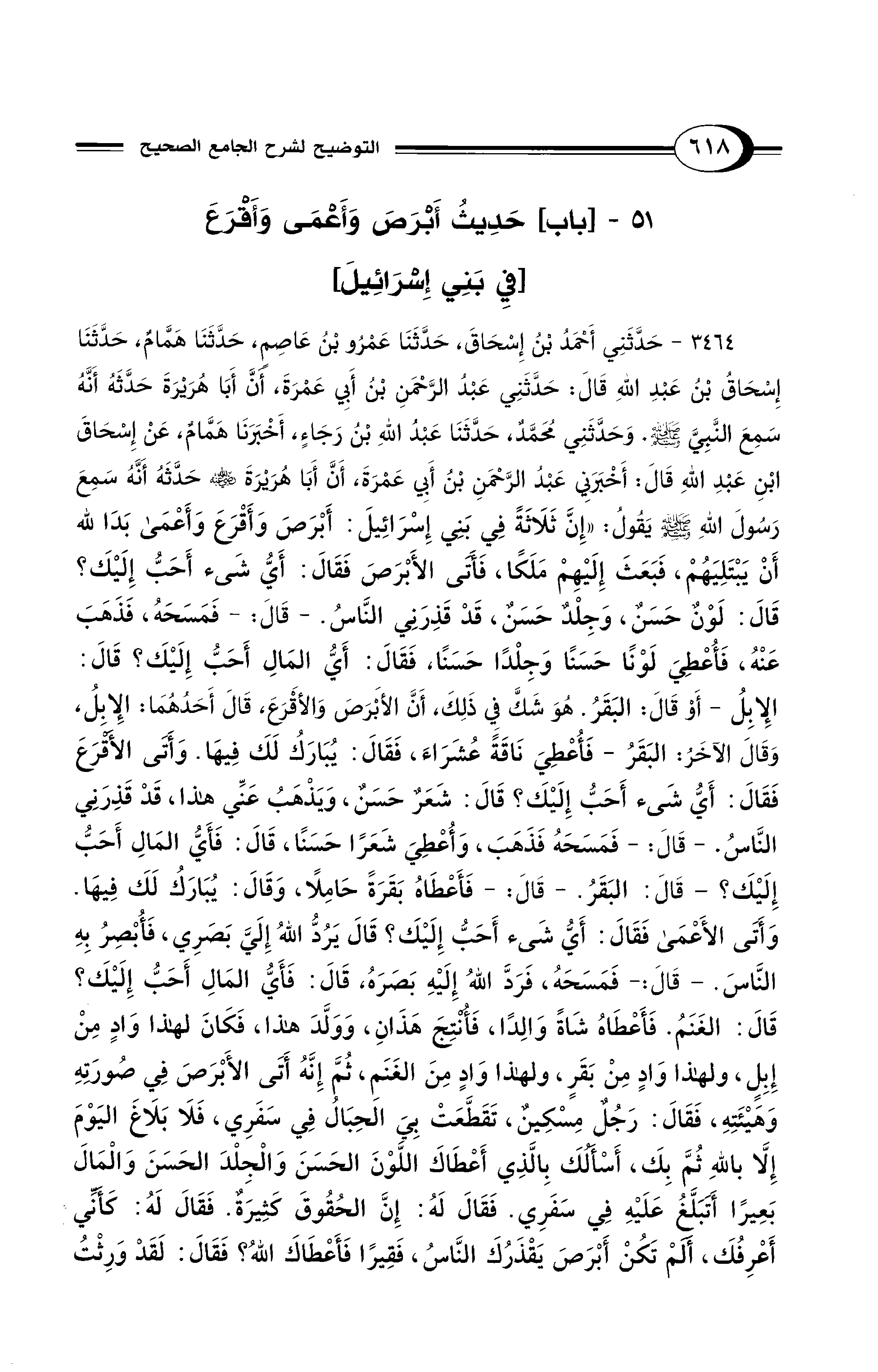 3464 - حَدَّثَنِي أَحْمَدُ بْنُ إِسْحَاقَ, حَدَّثَنَا عَمْرُو بْنُ عَاصِمٍ, حَدَّثَنَا هَمَّامٌ, حَدَّثَنَا إِسْحَاقُ بْنُ عَبْدِ اللهِ قَالَ: حَدَّثَنِي عَبْدُ الرَّحْمَنِ بْنُ أَبِي عَمْرَةَ, أَنَّ أَبَا هُرَيْرَةَ حَدَّثَهُ أَنَّهُ سَمِعَ النَّبِيَّ - صلى الله عليه وسلم -. وَحَدَّثَنِي مُحَمَّدٌ, حَدَّثَنَا عَبْدُ اللهِ بْنُ رَجَاءٍ, أَخْبَرَنَا هَمَّامٌ, عَنْ إِسْحَاقَ بْنِ عَبْدِ اللهِ قَالَ: أَخْبَرَنِي عَبْدُ الرَّحْمَنِ بْنُ أَبِى عَمْرَةَ, أَنَّ أَبَا هُرَيْرَةَ - رضي الله عنه - حَدَّثَهُ أَنَّهُ سَمِعَ رَسُولَ اللهِ - صلى الله عليه وسلم - يَقُولُ: «إِنَّ ثَلاَثَةً فِي بَنِي إِسْرَائِيلَ: أَبْرَصَ وَأَقْرَعَ وَأَعْمَى بَدَا لِلَّهِ أَنْ يَبْتَلِيَهُمْ، فَبَعَثَ إِلَيْهِمْ مَلَكًا، فَأَتَى الأَبْرَصَ. فَقَالَ: أَيُّ شَىْءٍ أَحَبُّ إِلَيْكَ؟ قَالَ: لَوْنٌ حَسَنٌ, وَجِلْدٌ حَسَنٌ، قَدْ قَذِرَنِي النَّاسُ. -قَالَ:- فَمَسَحَهُ، فَذَهَبَ عَنْهُ، فَأُعْطِيَ لَوْنًا حَسَنًا وَجِلْدًا حَسَنًا. فَقَالَ: أَيُّ الْمَالِ أَحَبُّ إِلَيْكَ؟ قَالَ: الإِبِلُ -أَوْ قَالَ: الْبَقَرُ. هُوَ شَكَّ فِي ذَلِكَ، إِنَّ الأَبْرَصَ وَالأَقْرَعَ، قَالَ أَحَدُهُمَا: الإِبِلُ، وَقَالَ الآخَرُ: الْبَقَرُ -فَأُعْطِيَ نَاقَةً عُشَرَاءَ. فَقَالَ: يُبَارَكُ لَكَ فِيهَا. وَأَتَى الأَقْرَعَ فَقَالَ: أَيُّ شَيْءٍ أَحَبُّ إِلَيْكَ؟ قَالَ: شَعَرٌ حَسَنٌ، وَيَذْهَبُ عَنِّي هَذَا، قَدْ قَذِرَنِي النَّاسُ. -قَالَ:- فَمَسَحَهُ فَذَهَبَ، وَأُعْطِيَ شَعَرًا حَسَنًا. قَالَ: فَأَيُّ المَالِ أَحَبُّ إِلَيْكَ؟ -قَالَ: البَقَرُ. قَالَ:- فَأَعْطَاهُ بَقَرَةً حَامِلاً، وَقَالَ: يُبَارَكُ لَكَ فِيهَا. وَأَتَى الأَعْمَى فَقَالَ: أَيُّ شَيْءٍ أَحَبُّ إِلَيْكَ؟ قَالَ يَرُدُّ اللهُ إِلَيَّ بَصَرِي، فَأُبْصِرُ بِهِ النَّاسَ -قَالَ:- فَمَسَحَهُ، فَرَدَّ اللهُ إِلَيْهِ بَصَرَهُ. قَالَ: فَأَيُّ الْمَالِ أَحَبُّ إِلَيْكَ؟ قَالَ: الغَنَمُ. فَأَعْطَاهُ شَاةً وَالِدًا، فَأُنْتِجَ هَذَانِ، وَوَلَّدَ هَذَا، فَكَانَ لِهَذَا وَادٍ مِنْ إِبِلٍ، وَلِهَذَا وَادٍ مِنْ بَقَرٍ، وَلِهَذَا وَادٍ مِنَ الْغَنَمِ. ثُمَّ إِنَّهُ أَتَى الأَبْرَصَ فِي صُورَتِهِ وَهَيْئَتِهِ, فَقَالَ: رَجُلٌ مِسْكِينٌ، تَقَطَّعَتْ بِيَ الْحِبَالُ فِي سَفَرِي، فَلاَ بَلاَغَ اليَوْمَ إِلاَّ بِاللهِ ثُمَّ بِكَ، أَسْأَلُكَ بِالَّذِى أَعْطَاكَ اللَّوْنَ الحَسَنَ وَالْجِلْدَ الحَسَنَ وَالْمَالَ بَعِيرًا أَتَبَلَّغُ عَلَيْهِ فِي سَفَرِي. فَقَالَ لَهُ: إِنَّ الحُقُوقَ كَثِيرَةٌ. فَقَالَ لَهُ: كَأَنِّي أَعْرِفُكَ، أَلَمْ تَكُنْ أَبْرَصَ يَقْذَرُكَ النَّاسُ فَقِيرًا فَأَعْطَاكَ اللهُ؟ فَقَالَ: لَقَدْ وَرِثْتُ