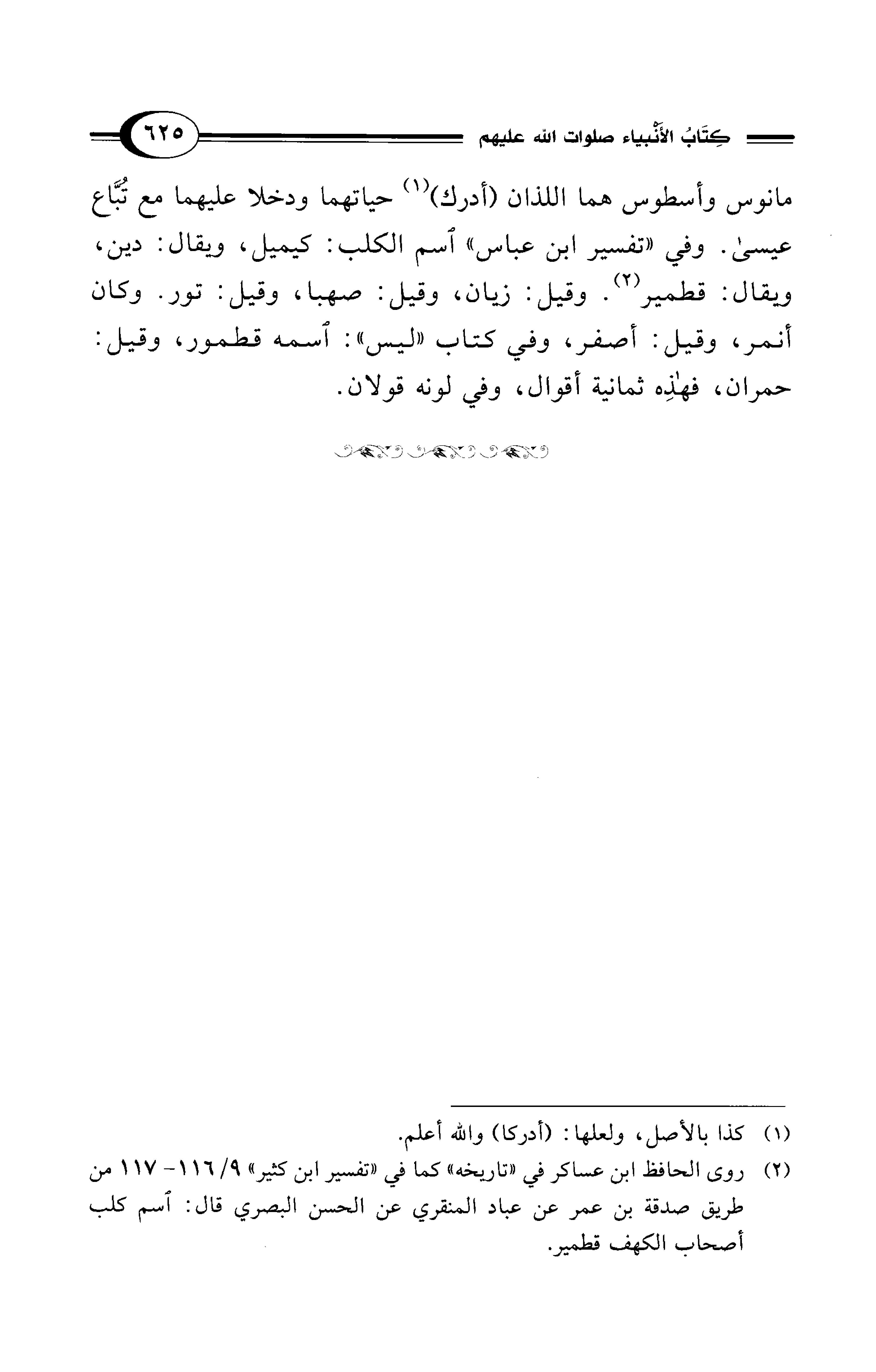 (¬2) روى الحافظ ابن عساكر في "تاريخه" كما في "تفسير ابن كثير" 9/ 116 - 117 من طريق صدقة بن عمر عن عباد المنقري عن الحسن البصري قال: اسم كلب أصحاب الكهف قطمير.