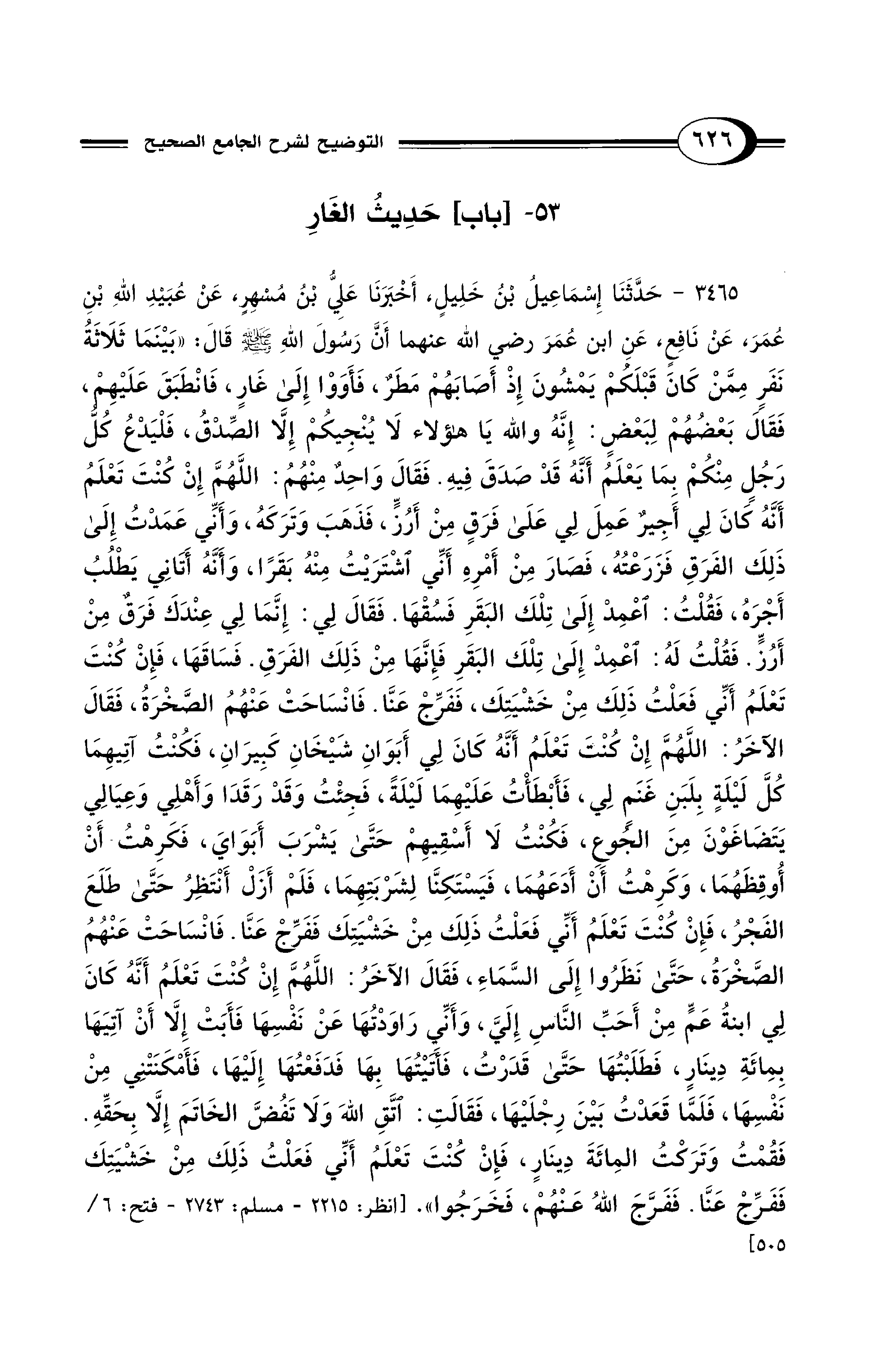3465 - حَدَّثَنَا إِسْمَاعِيلُ بْنُ خَلِيلٍ, أَخْبَرَنَا عَلِيُّ بْنُ مُسْهِرٍ, عَنْ عُبَيْدِ اللهِ بْنِ عُمَرَ, عَنْ نَافِعٍ عَنِ ابْنِ عُمَرَ - رضي الله عنهما - أَنَّ رَسُولَ اللهِ - صلى الله عليه وسلم - قَالَ: «بَيْنَمَا ثَلاَثَةُ نَفَرٍ مِمَّنْ كَانَ قَبْلَكُمْ يَمْشُونَ إِذْ أَصَابَهُمْ مَطَرٌ، فَأَوَوْا إِلَى غَارٍ، فَانْطَبَقَ عَلَيْهِمْ، فَقَالَ بَعْضُهُمْ لِبَعْضٍ: إِنَّهُ وَاللهِ يَا هَؤُلاَءِ لاَ يُنْجِيكُمْ إِلاَّ الصِّدْقُ، فَلْيَدْعُ كُلُّ رَجُلٍ مِنْكُمْ بِمَا يَعْلَمُ أَنَّهُ قَدْ صَدَقَ فِيهِ. فَقَالَ وَاحِدٌ مِنْهُمُ: اللَّهُمَّ إِنْ كُنْتَ تَعْلَمُ أَنَّهُ كَانَ لِي أَجِيرٌ عَمِلَ لِي عَلَى فَرَقٍ مِنْ أَرُزٍّ، فَذَهَبَ وَتَرَكَهُ، وَأَنِّي عَمَدْتُ إِلَى ذَلِكَ الْفَرَقِ فَزَرَعْتُهُ، فَصَارَ مِنْ أَمْرِهِ أَنِّي اشْتَرَيْتُ مِنْهُ بَقَرًا، وَأَنَّهُ أَتَانِي يَطْلُبُ أَجْرَهُ فَقُلْتُ: اعْمِدْ إِلَى تِلْكَ الْبَقَرِ. فَسُقْهَا، فَقَالَ لِي: إِنَّمَا لِي عِنْدَكَ فَرَقٌ مِنْ أَرُزٍّ. فَقُلْتُ لَهُ: اعْمِدْ إِلَى تِلْكَ الْبَقَرِ فَإِنَّهَا مِنْ ذَلِكَ الْفَرَقِ. فَسَاقَهَا، فَإِنْ كُنْتَ تَعْلَمُ أَنِّي فَعَلْتُ ذَلِكَ مِنْ خَشْيَتِكَ، فَفَرِّجْ عَنَّا. فَانْسَاحَتْ عَنْهُمُ الصَّخْرَةُ. فَقَالَ الآخَرُ: اللَّهُمَّ إِنْ كُنْتَ تَعْلَمُ أَنَّهُ كَانَ لِي أَبَوَانِ شَيْخَانِ كَبِيرَانِ، فَكُنْتُ آتِيهِمَا كُلَّ لَيْلَةٍ بِلَبَنِ غَنَمٍ لِي، فَأَبْطَأْتُ عَلَيْهِمَا لَيْلَةً فَجِئْتُ وَقَدْ رَقَدَا وَأَهْلِي وَعِيَالِي يَتَضَاغَوْنَ مِنَ الجُوعِ، فَكُنْتُ لاَ أَسْقِيهِمْ حَتَّى يَشْرَبَ أَبَوَايَ، فَكَرِهْتُ أَنْ أُوقِظَهُمَا، وَكَرِهْتُ أَنْ أَدَعَهُمَا، فَيَسْتَكِنَّا لِشَرْبَتِهِمَا، فَلَمْ أَزَلْ أَنْتَظِرُ حَتَّى طَلَعَ الفَجْرُ، فَإِنْ كُنْتَ تَعْلَمُ أَنِّي فَعَلْتُ ذَلِكَ مِنْ خَشْيَتِكَ، فَفَرِّجْ عَنَّا. فَانْسَاحَتْ عَنْهُمُ الصَّخْرَةُ، حَتَّى نَظَرُوا إِلَى السَّمَاءِ. فَقَالَ الآخَرُ: اللَّهُمَّ إِنْ كُنْتَ تَعْلَمُ أَنَّهُ كَانَ لِي ابْنَةُ عَمٍّ مِنْ أَحَبِّ النَّاسِ إِلَيَّ، وَأَنِّي رَاوَدْتُهَا عَنْ نَفْسِهَا فَأَبَتْ إِلاَّ أَنْ آتِيَهَا بِمِائَةِ دِينَارٍ، فَطَلَبْتُهَا حَتَّى قَدَرْتُ، فَأَتَيْتُهَا بِهَا فَدَفَعْتُهَا إِلَيْهَا، فَأَمْكَنَتْنِي مِنْ نَفْسِهَا، فَلَمَّا قَعَدْتُ بَيْنَ رِجْلَيْهَا، فَقَالَتِ: اتَّقِ اللهَ وَلاَ تَفُضَّ الخَاتَمَ إِلاَّ بِحَقِّهِ. فَقُمْتُ وَتَرَكْتُ المِائَةَ دِينَارٍ، فَإِنْ كُنْتَ تَعْلَمُ أَنِّي فَعَلْتُ ذَلِكَ مِنْ خَشْيَتِكَ فَفَرِّجْ عَنَّا. فَفَرَّجَ اللهُ عَنْهُمْ فَخَرَجُوا». [انظر: 2215 - مسلم: 2743 - فتح: 6/ 505]