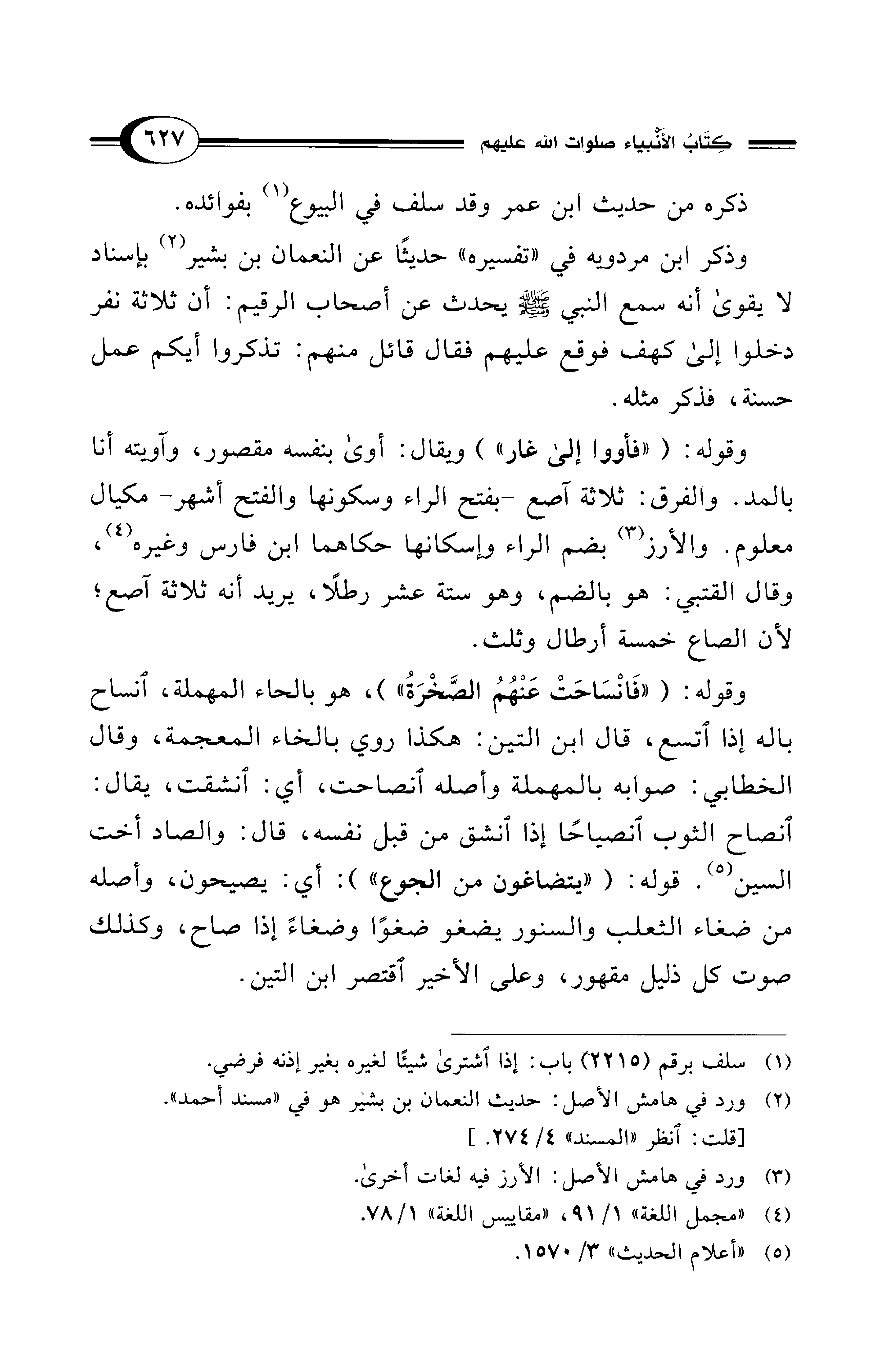 وقوله: ("فأووا إلى غار") ويقال: أوى بنفسه مقصور، وآويته أنا بالمد. والفرق: ثلاثة آصع -بفتح الراء وسكونها والفتح أشهر- مكيال معلوم. والأرز (¬3) بضم الراء وإسكانها حكاهما ابن فارس وغيره (¬4)، وقال القتبي: هو بالضم، وهو ستة عشر رطلاً، يريد أنه ثلاثة آصع؛ لأن الصالح خمسة أرطال وثلث.