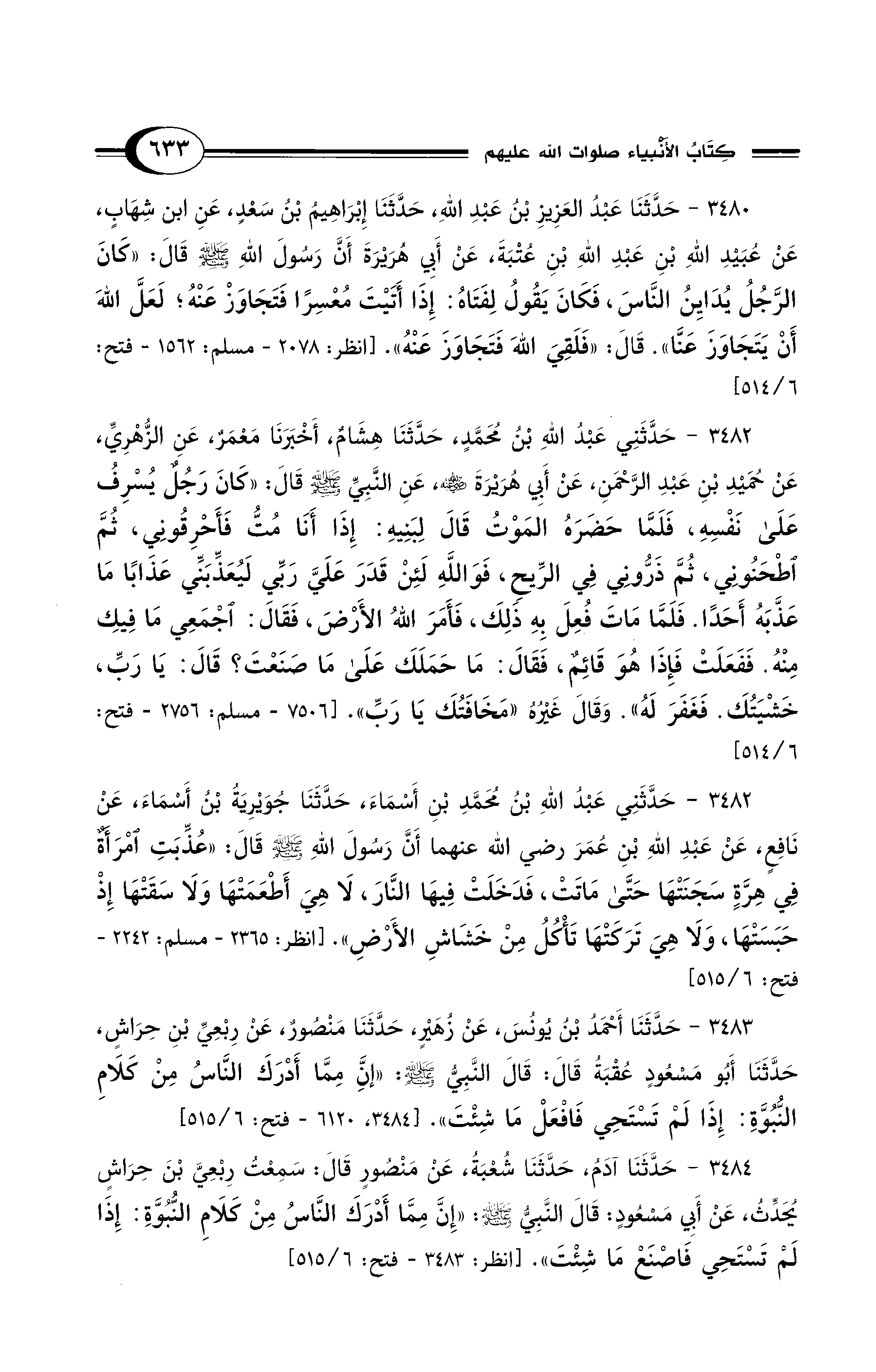 3481 - حَدَّثَنِي عَبْدُ اللهِ بْنُ مُحَمَّدٍ, حَدَّثَنَا هِشَامٌ, أَخْبَرَنَا مَعْمَرٌ, عَنِ الزُّهْرِيِّ, عَنْ حُمَيْدِ بْنِ عَبْدِ الرَّحْمَنِ, عَنْ أَبِي هُرَيْرَةَ - رضي الله عنه -, عَنِ النَّبِيِّ - صلى الله عليه وسلم - قَالَ: «كَانَ رَجُلٌ يُسْرِفُ عَلَى نَفْسِهِ، فَلَمَّا حَضَرَهُ الْمَوْتُ قَالَ لِبَنِيهِ: إِذَا أَنَا مُتُّ فَأَحْرِقُونِي, ثُمَّ اطْحَنُونِي, ثُمَّ ذَرُّونِي فِي الرِّيحِ، فَوَاللهِ لَئِنْ قَدَرَ عَلَيَّ رَبِّي لَيُعَذِّبَنِّي عَذَابًا مَا عَذَّبَهُ أَحَدًا. فَلَمَّا مَاتَ فُعِلَ بِهِ ذَلِكَ، فَأَمَرَ اللهُ الأَرْضَ، فَقَالَ: اجْمَعِي مَا فِيكِ مِنْهُ. فَفَعَلَتْ فَإِذَا هُوَ قَائِمٌ، فَقَالَ: مَا حَمَلَكَ عَلَى مَا صَنَعْتَ؟ قَالَ: يَا رَبِّ، خَشْيَتُكَ. فَغَفَرَ لَهُ». وَقَالَ غَيْرُهُ «مَخَافَتُكَ يَا رَبِّ». [7506 - مسلم: 2756 - فتح: 6/ 514]