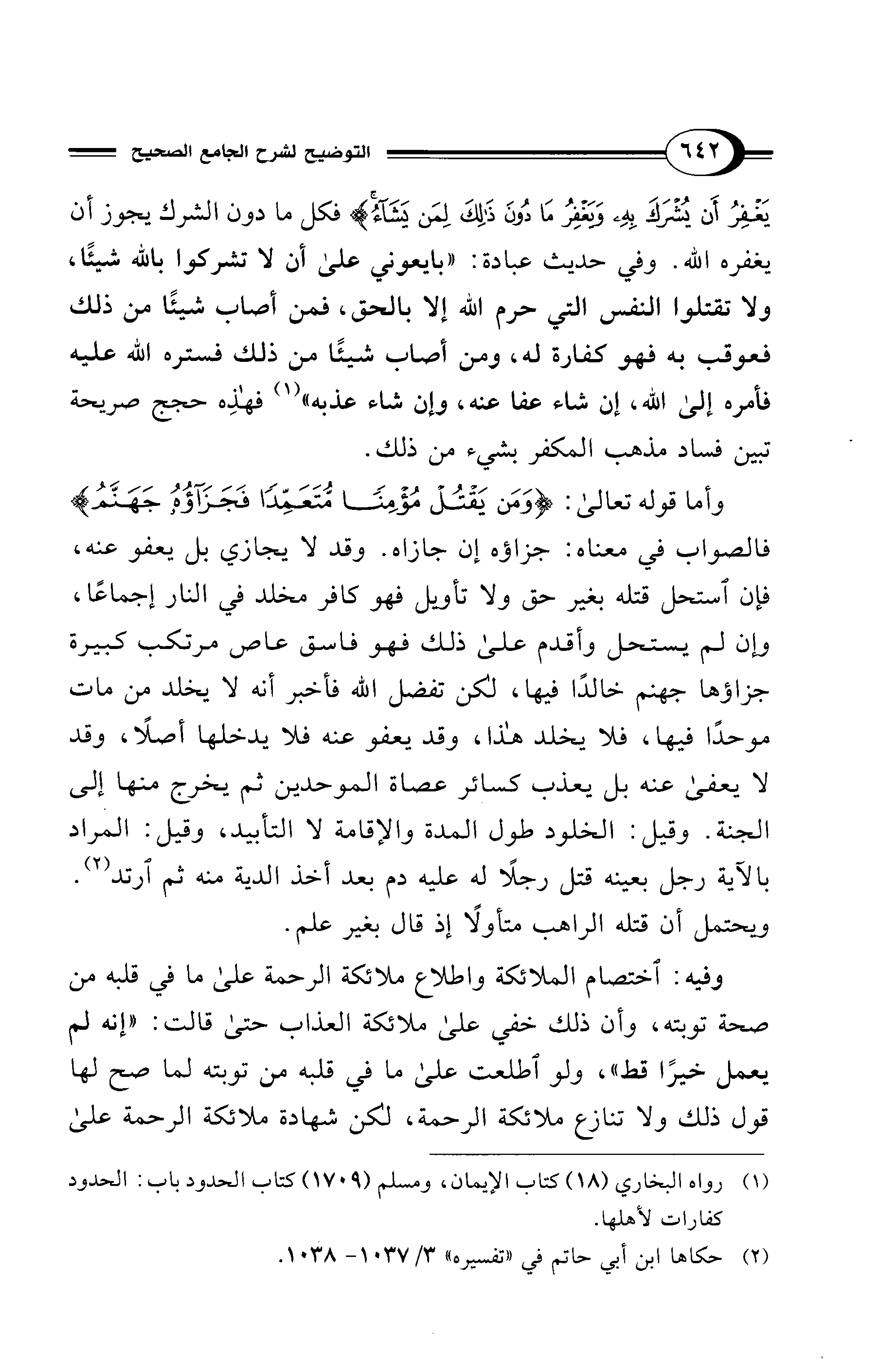 وأما قوله تعالى: {وَمَنْ يَقْتُلْ مُؤْمِنًا مُتَعَمِّدًا فَجَزَاؤُهُ جَهَنَّمُ} فالصواب في معناه: جزاؤه إن جازاه. وقد لا يجازي بل يعفو عنه، فإن استحل قتله بغير حق ولا تأويل فهو كافر مخلد في النار إجماعًا، وإن لم يستحل وأقدم على ذلك فهو فاسق عاص مرتكب كبيرة جزاؤها جهنم خالدًا فيها لكن تفضل الله فأخبر أنه لا يخلد من مات موحدًا فيها، فلا يخلد هذا، وقد يعفو عنه فلا يدخلها أصلاً، وقد لا يعفى عنه بل يعذب كسائر عصاة الموحدين ثم يخرج منها إلى الجنة. وقيل: الخلود طول المدة والإقامة لا التأبيد، وقيل: المراد بالآية رجل بعينه قتل رجلاً له عليه دم بعد أخذ الدية منه ثم ارتد (¬2). ويحتمل أن قتله الراهب متأولًا إذ قال بغير علم.