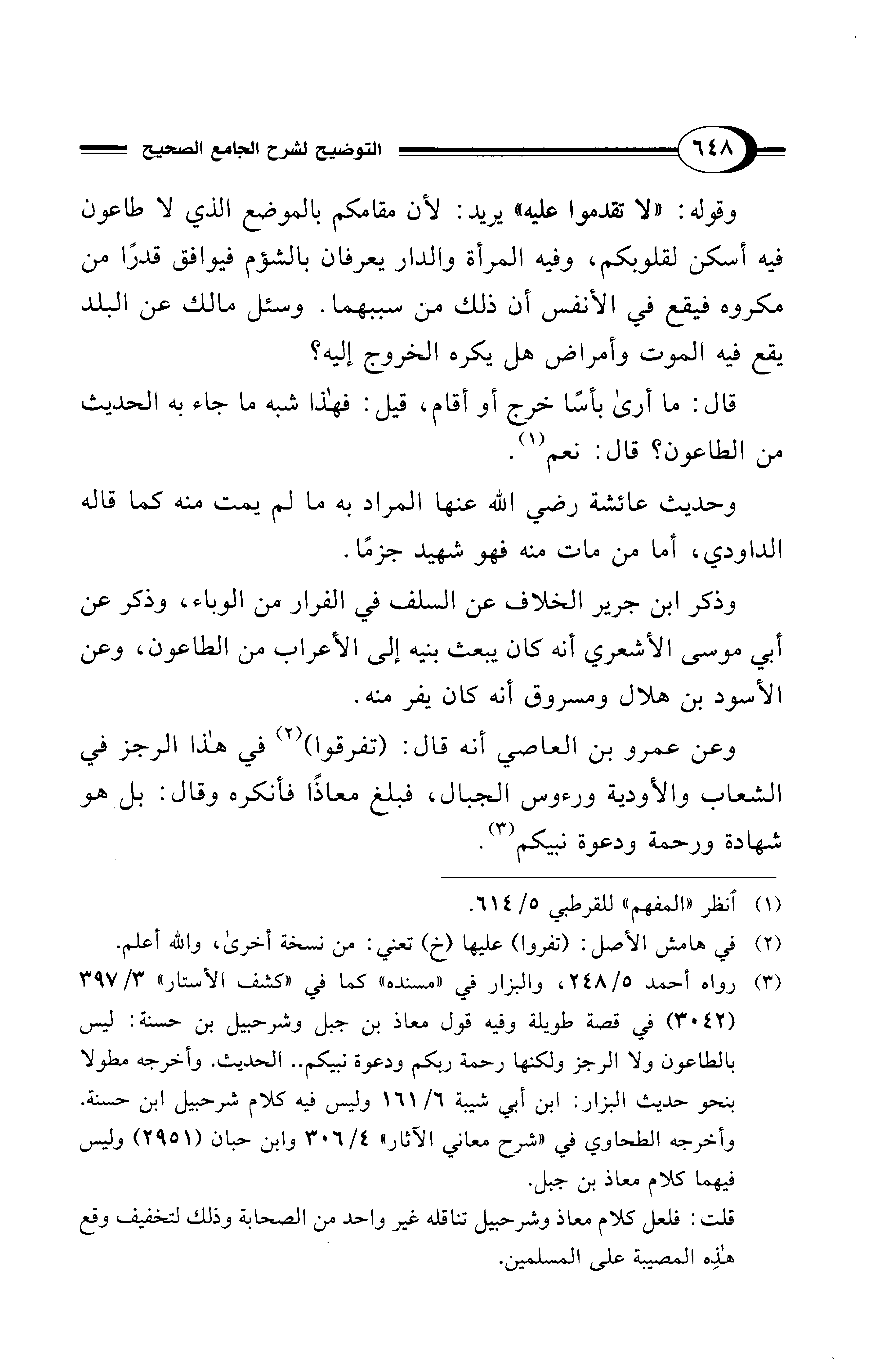 وعن عمرو بن العاصي أنه قال: (تفرقوا) (¬2) في هذا الرجز في الشعاب والأودية ورءوس الجبال، فبلغ معاذًا فأنكره وقال: بل هو شهادة ورحمة ودعوة نبيكم (¬3).
