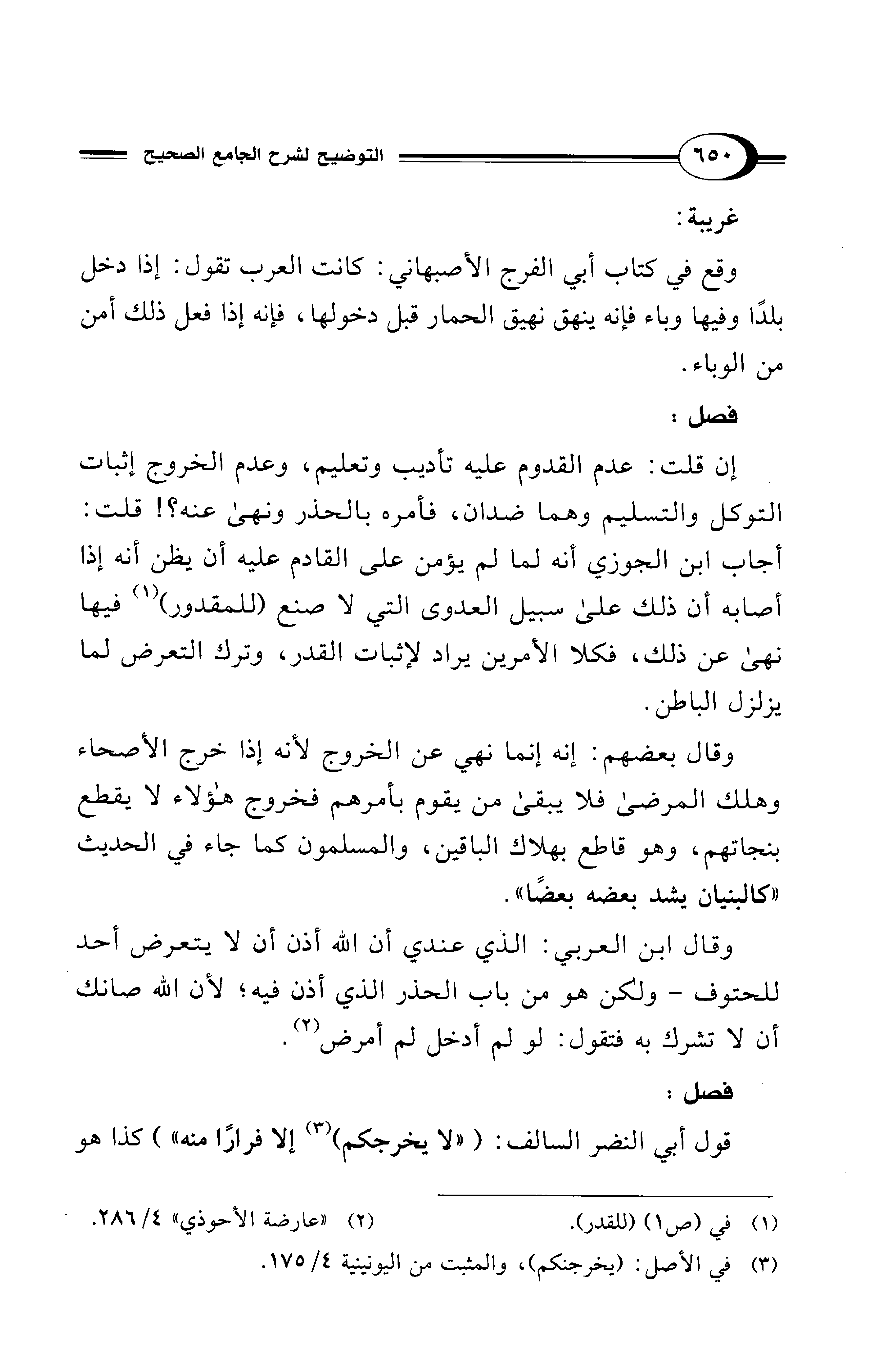 إن قلت: عدم القدوم عليه تأديب وتعليم، وعدم الخروج إثبات التوكل والتسليم وهما ضدان، فأمره بالحذر عنه؟! قلت: أجاب ابن الجوزي أنه لما لم يؤمن على القادم عليه أن يظن أنه إذا أصابه أن ذلك على سبيل العدوى التي لا صنع (للمقدور) (¬1) فيها نهى عن ذلك، فكلا الأمرين يراد لإثبات القدر، وترك التعرض لما يزلزل الباطن.