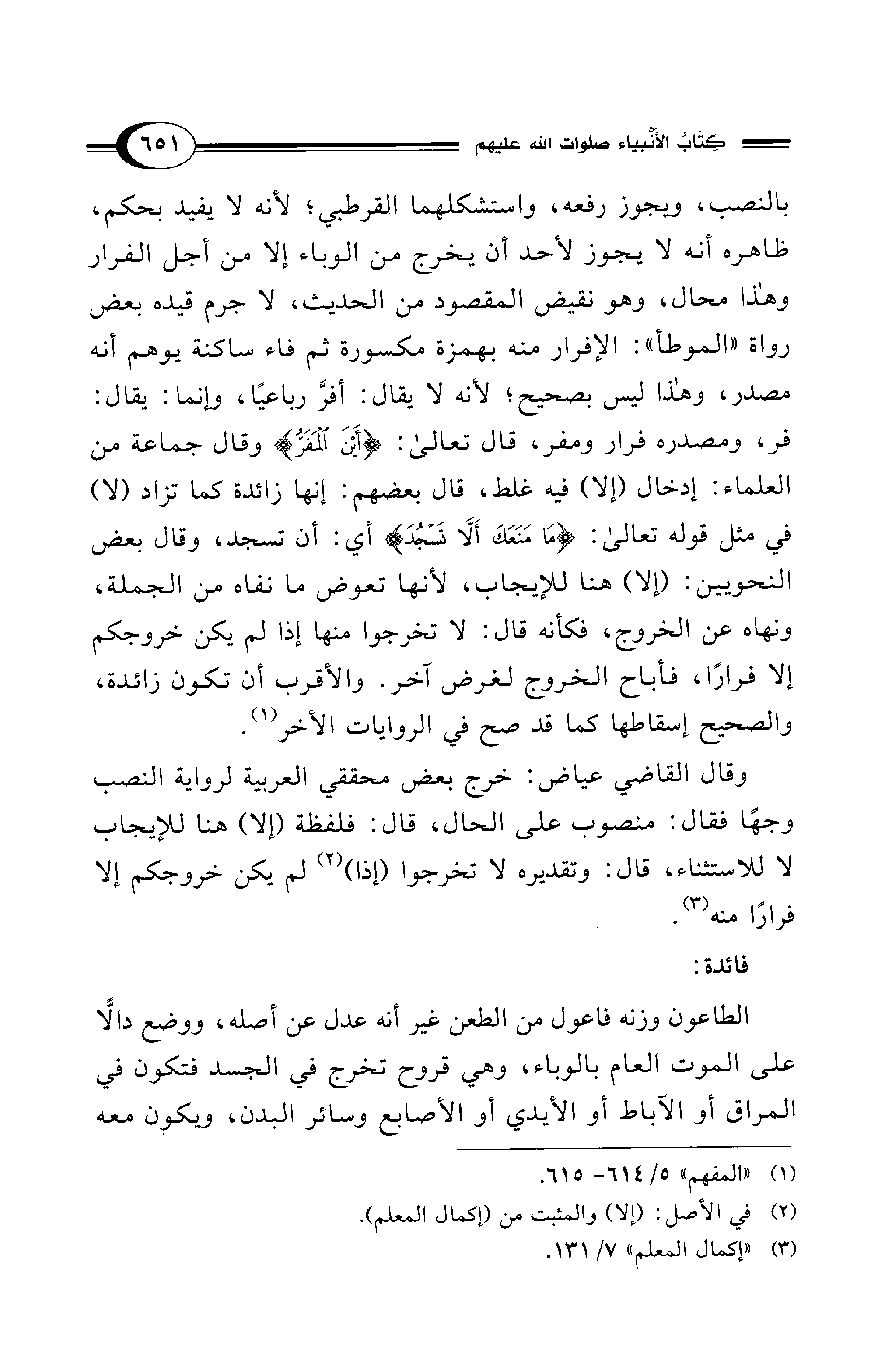 وقال القاضي عياض: خرج بعض محققي العربية لرواية النصب وجهًا فقال: منصوب على الحال، قال: فلفظة (إلا) هنا للإيجاب لا للاستثناء، قال: وتقديره لا تخرجوا (إذا) (¬2) لم يكن خروجكم إلا فرارًا منه (¬3).