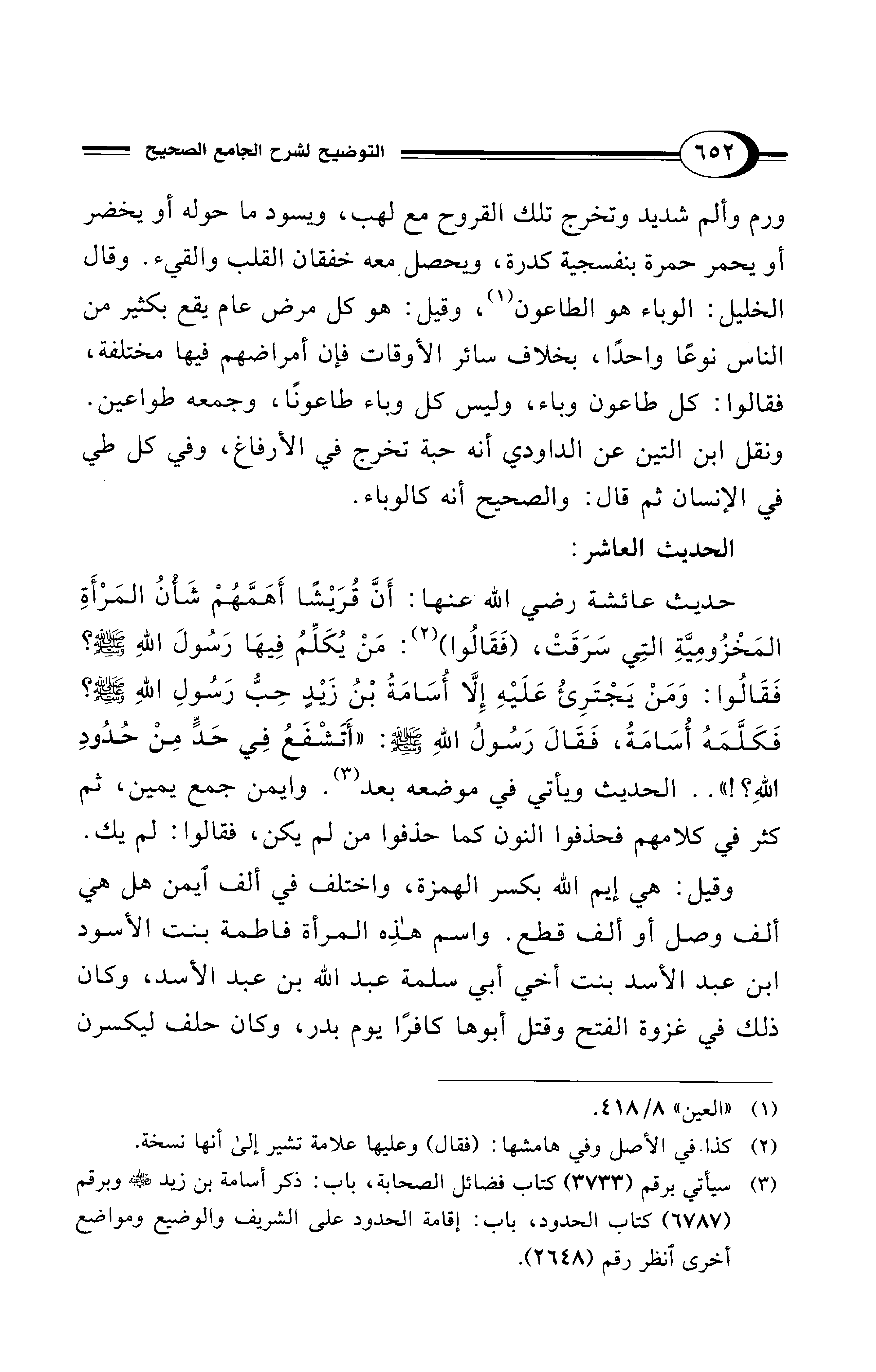 (¬3) سيأتي برقم (3733) كتاب "فضائل الصحابة" باب: ذكر أسامة بن زيد - رضي الله عنه - وبرقم (6787) كتاب الحدود، باب: إقامة الحدود على الشريف والوضيع ومواضع أخرى انظر رقم (2648).
