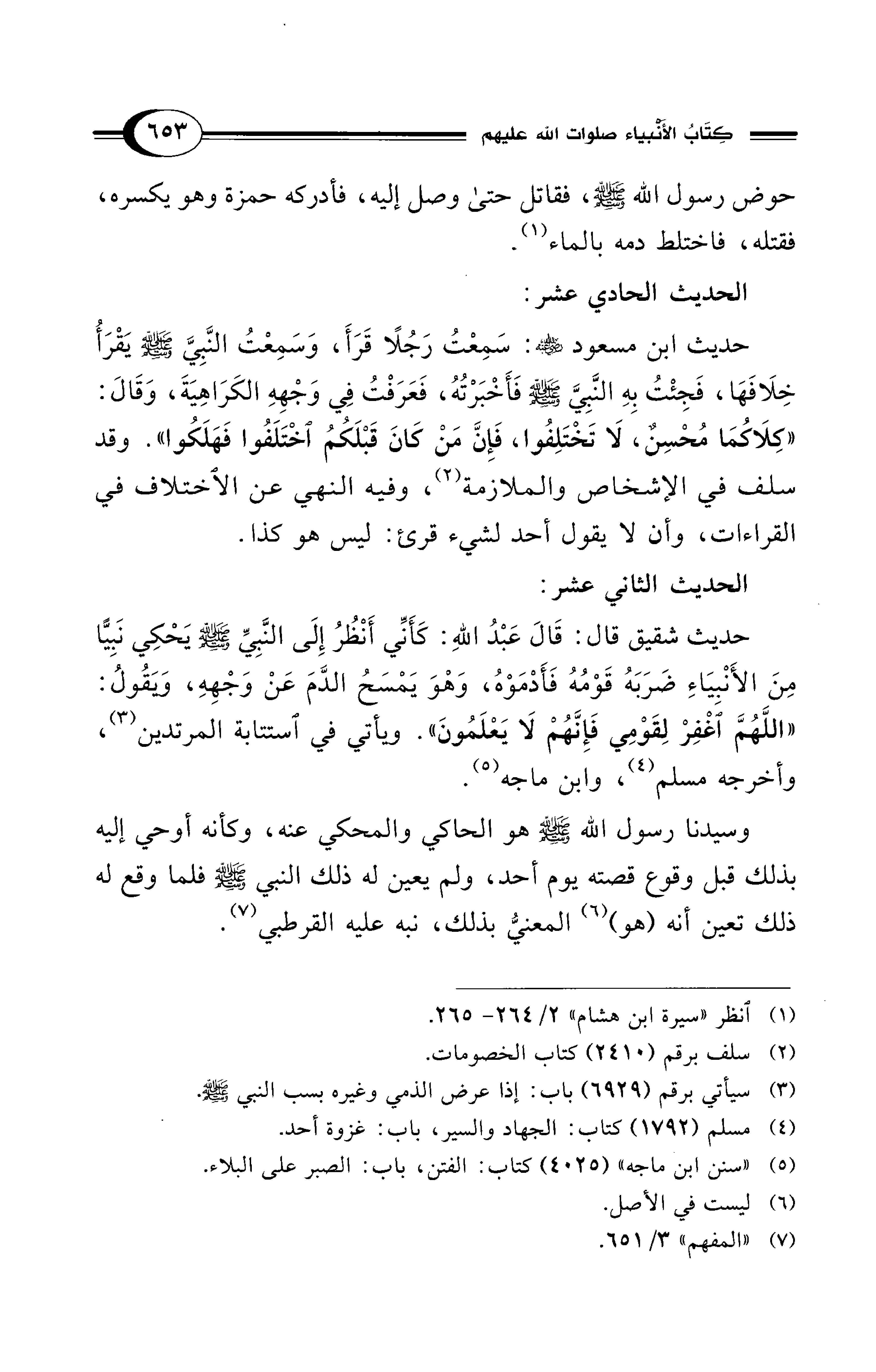 حديث شقيق قال: قَالَ عَبْدُ الله: كَأَنِّي أَنْظُرُ إِلَى النَّبِيِّ - صلى الله عليه وسلم - يَحْكِي نَبِيًّا مِنَ الأَنْبيَاءِ ضرَبَهُ قَوْمُهُ فَأَدْمَوْهُ، وَهْوَ يَمْسَحُ الدَّمَ عَنْ وَجْهِهِ، وَيَقُولُ: "اللَّهُمَّ اغْفِرْ لِقَوْمِي فَإِنَّهُمْ لَا يَعْلَمُونَ". ويأتي في استتابة المرتدين (¬3)، وأخرجه مسلم (¬4)، وابن ماجه (¬5).