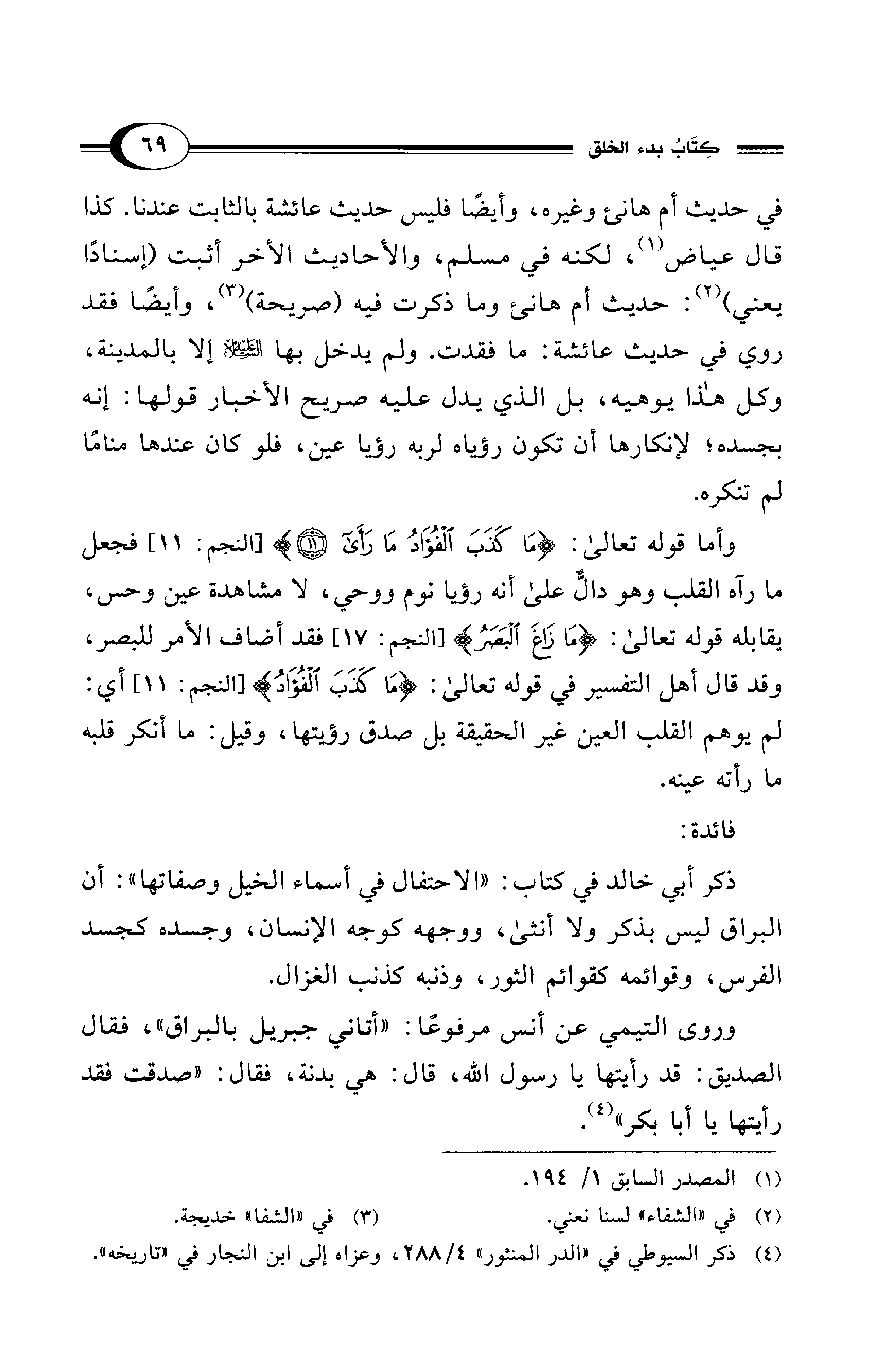 في حديث أم هانئ وغيره، وأيضًا فليس حديث عائشة بالثابت عندنا. كذا قال عياض (¬1)، لكنه في مسلم، والأحاديث الآخر أثبت (إسنادًا يعني) (¬2): حديث أم هانئ وما ذكرت فيه (صريحة) (¬3)، وأيضًا فقد روي في حديث عائشة: ما فقدت. ولم يدخل بها - عليه السلام - إلا بالمدينة، وكل هذا يوهيه، بل الذي يدل عليه صريح الأخبار قولها: إنه بجسده؛ لإنكارها أن تكون رؤياه لربه رؤيا عين، فلو كان عندها منامًا لم تنكره.