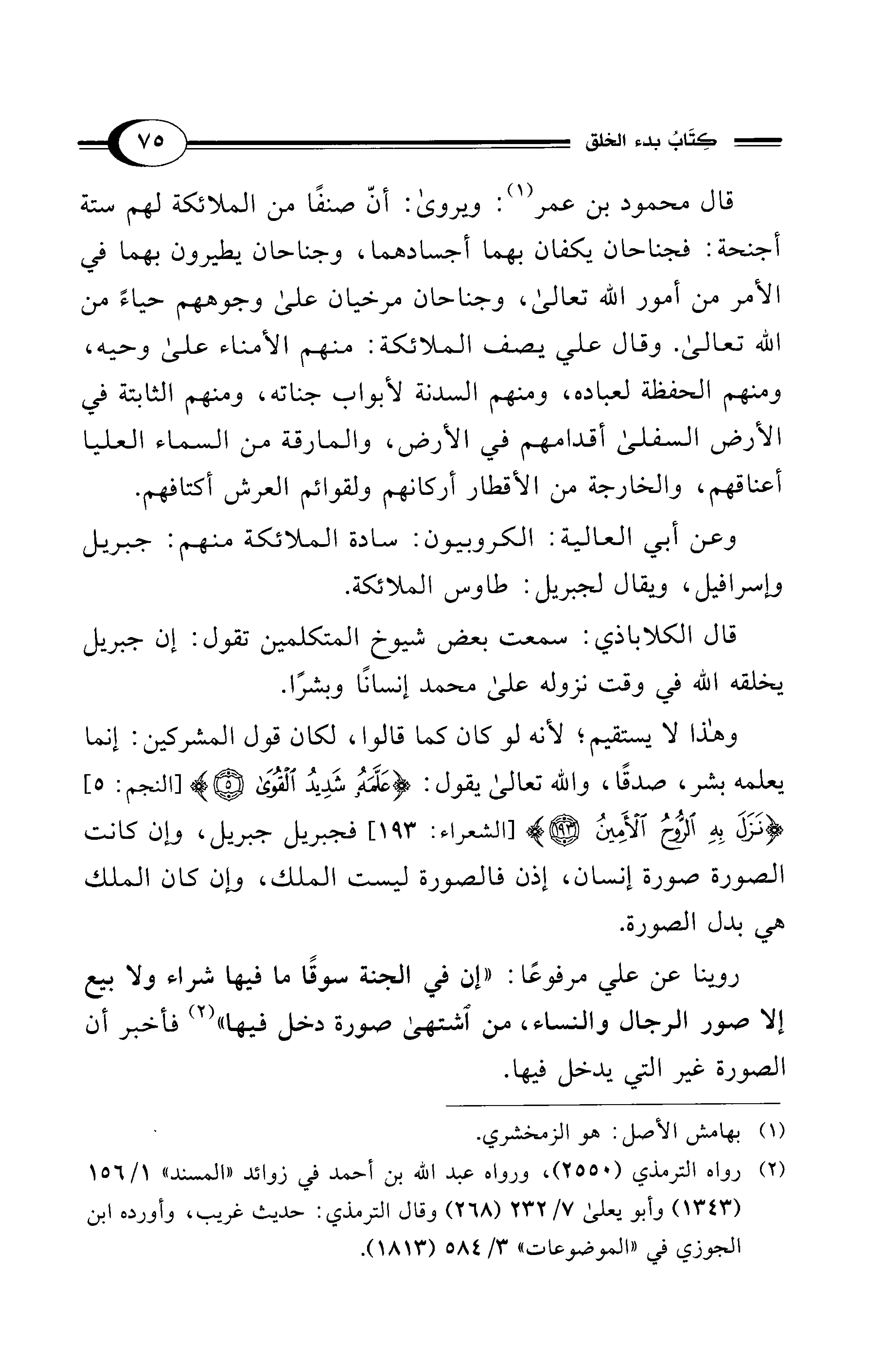 قال محمود بن عمر (¬1): ويروى: أنّ صنفًا من الملائكة لهم ستة أجنحة: فجناحان يكفان بهما أجسادهما، وجناحان يطيرون بهما في الأمر من أمور الله تعالى، وجناحان مرخيان على وجوههم حياءً من الله تعالى. وقال على يصف الملائكة: منهم الأمناء على وحيه، ومنهم الحفظة لعباده، ومنهم السدنة لأبواب جناته، ومنهم الثابتة في الأرض السفلى أقدامهم في الأرض، والمارقة من السماء العليا أعناقهم، والخارجة من الأقطار أركانهم ولقوائم العرش أكتافهم.