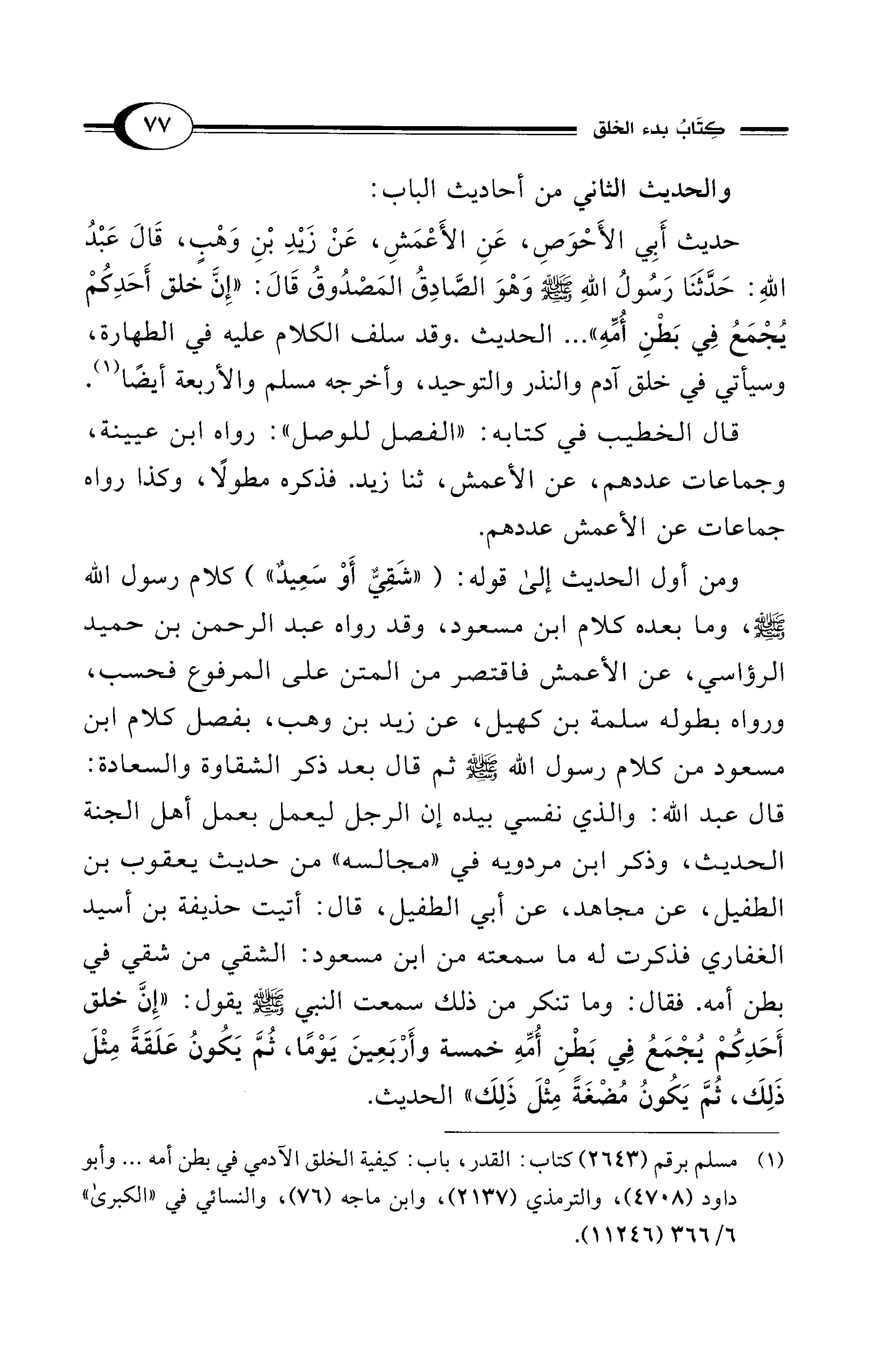 حديث أَبِي الأَحْوَصِ، عَنِ الأَعْمَشِ، عَنْ زَيْدِ بْنِ وَهْبٍ، قَالَ عَبْدُ اللهِ: حَدَّثَنَا رَسُولُ اللهِ - صلى الله عليه وسلم - وَهْوَ الصَّادِقُ المَصْدُوقُ قَالَ: "إِنَّ خلق أَحَدِكُمْ يُجْمَعُ فِي بَطْنِ أُمِّهِ" ... الحديث. وقد سلف الكلام عليه في الطهارة، وسيأتي في خلق آدم والنذر والتوحيد، وأخرجه مسلم والأربعة أيضًا (¬1).