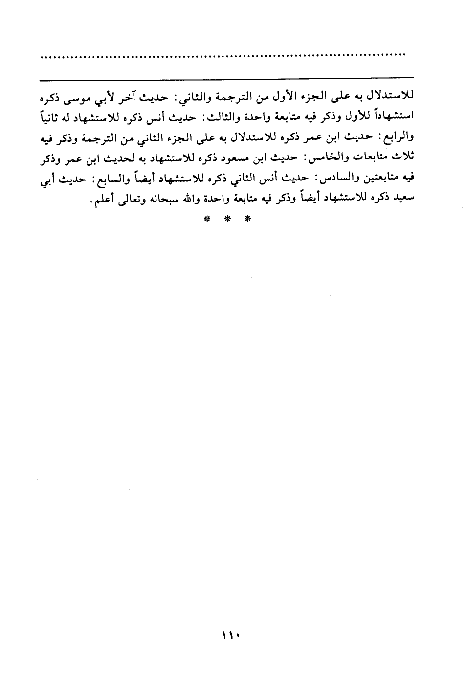 للاستدلال به على الجزء الأول من الترجمة والثاني: حديث آخر لأبي موسى ذكره استشهادًا للأول وذكر فيه متابعة واحدة والثالث: حديث أنس ذكره للاستشهاد له ثانيًا والرابع: حديث ابن عمر ذكره للاستدلال به على الجزء الثاني من الترجمة وذكر فيه ثلاث متابعات والخاص: حديث ابن مسعود ذكره للاستشهاد به لحديث ابن عمر وذكر فيه متابعتين والسادس: حديث أنس الثاني ذكره للاستشهاد أيضًا والسابع: حديث أبي سعيد ذكره للاستشهاد أيضًا وذكر فيه متابعة واحدة والله سبحانه وتعالى أعلم.