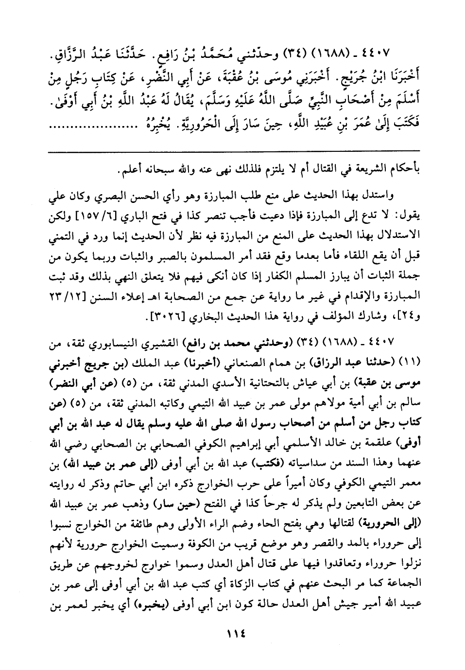 ٤٤٠٧ - (١٦٨٨) (٣٤) وحدّثني مُحَمَّدُ بْنُ رَافِعٍ. حَدَّثَنَا عَبْدُ الرَّزَّاقِ. أَخْبَرَنَا ابْنُ جُرَيجٍ. أَخْبَرَنِي مُوسَى بْنُ عُقْبَةَ، عَنْ أَبِي النَّضْرِ، عَنْ كِتَابِ رَجُلٍ مِنْ أَسْلَمَ مِنْ أصْحَابِ النَّبِيِّ صَلَّى اللهُ عَلَيهِ وَسَلَّمَ، يُقَالُ لَهُ عَبْدُ اللهِ بْنُ أَبِي أَوْفَى. فَكَتَبَ إِلَى عُمَرَ بْنِ عُبَيدِ اللهِ، حِينَ سَارَ إِلَى الْحَرُورِيَّةِ. يُخْبِرُهُ