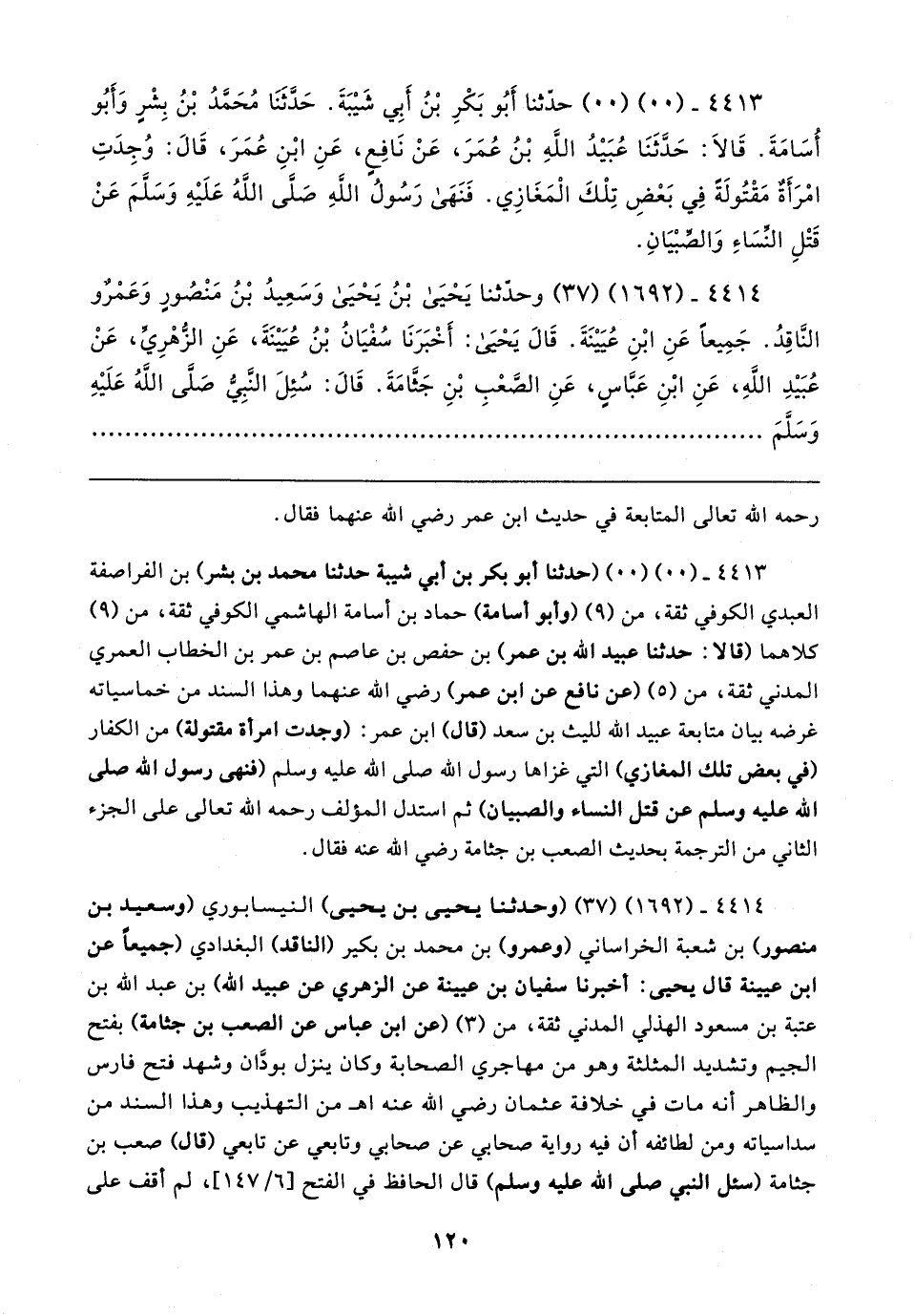 ٤٤١٣ - (٠٠) (٠٠) (حدثنا أبو بكر بن أبي شيبة حدثنا محمد بن بشر) بن الفراصفة العبدي الكوفي ثقة، من (٩) (وأبو أسامة) حماد بن أسامة الهاشمي الكوفي ثقة، من (٩) كلاهما (قالا: حدثنا عبيد الله بن عمر) بن حفص بن عاصم بن عمر بن الخطاب العمري المدني ثقة، من (٥) (عن نافع عن ابن عمر) رضي الله عنهما وهذا السند من خماسياته غرضه بيان متابعة عبيد الله لليث بن سعد (قال) ابن عمر: (وجدت امرأة مقتولة) من الكفار (في بعض تلك المغازي) التي غزاها رسول الله صلى الله عليه وسلم (فنهى رسول الله صلى الله عليه وسلم عن قتل النساء والصبيان) ثم استدل المؤلف رحمه الله تعالى على الجزء الثاني من الترجمة بحديث الصعب بن جثامة رضي الله عنه فقال.