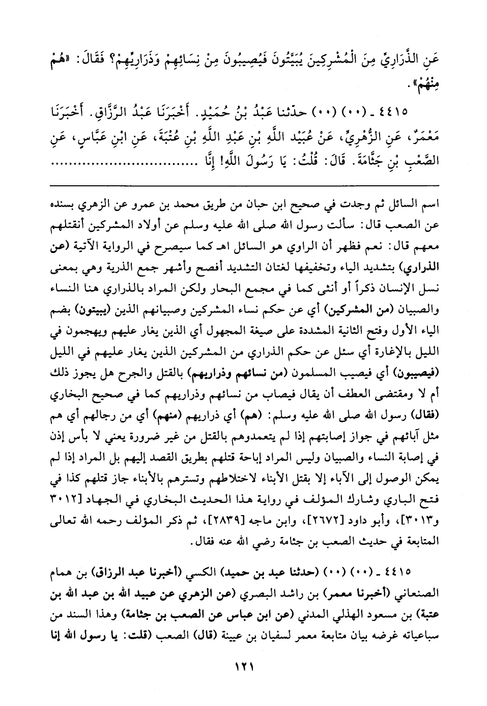 ٤٤١٥ - (٠٠) (٠٠) (حدثنا عبد بن حميد) الكسي (أخبرنا عبد الرزاق) بن همام الصنعاني (أخبرنا معمر) بن راشد البصري (عن الزهري عن عبيد الله بن عبد الله بن عتبة) بن مسعود الهذلي المدني (عن ابن عباس عن الصعب بن جثامة) وهذا السند من سباعياته غرضه بيان متابعة معمر لسفيان بن عيينة (قال) الصعب (قلت: يا رسول الله إنا