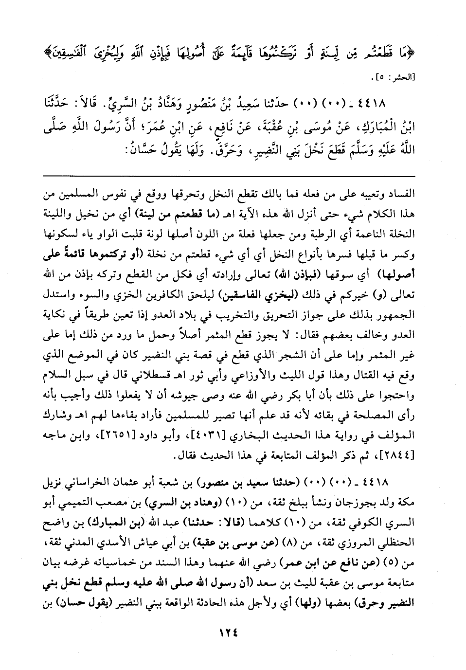 ٤٤١٨ - (٠٠) (٠٠) (حدثنا سعيد بن منصور) بن شعبة أبو عثمان الخراساني نزيل مكة ولد بجوزجان ونشأ ببلخ ثقة، من (١٠) (وهناد بن السري) بن مصعب التميمي أبو السري الكوفي ثقة، من (١٠) كلاهما (قالا: حدثنا) عبد الله (بن المبارك) بن واضح الحنظلي المروزي ثقة، من (٨) (عن موسى بن عقبة) بن أبي عياش الأسدي المدني ثقة، من (٥) (عن نافع عن ابن عمر) رضي الله عنهما وهذا السند من خماسياته غرضه بيان متابعة موسى بن عقبة لليث بن سعد (أن رسول الله صلى الله عليه وسلم قطع نخل بني النضير وحرق) بعضها (ولها) أي ولأجل هذه الحادثة الواقعة ببني النضير (يقول حسان) بن