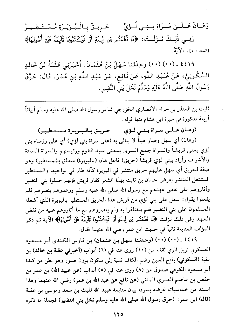 ٤٤١٩ - (٠٠) (٠٠) (وحدثنا سهل بن عثمان) بن فارس الكندي أبو مسعود العسكري نزيل الري ثقة، من (١٠) روى عنه في (٦) أبواب (أخبرني عقبة بن خالد) بن عقبة (السكوني) بفتح السين وضم الكاف نسبة إلى سكون بوزن صبور وهو بطن من كندة أبو مسعود الكوفي صدوق من (٨) روى عنه في (٥) أبواب (عن عبيد الله) بن عمر بن حفص بن عاصم العمري المدني (عن نافع عن عبد الله بن عمر) رضي الله عنهما وهذا السند من خماسياته غرضه بسوقه بيان متابعة عبيد الله لليث بن سعد وموسى بن عقبة (قال) ابن عمر: (حرق رسول الله صلى الله عليه وسلم نخل بني النضير) فجملة ما ذكره