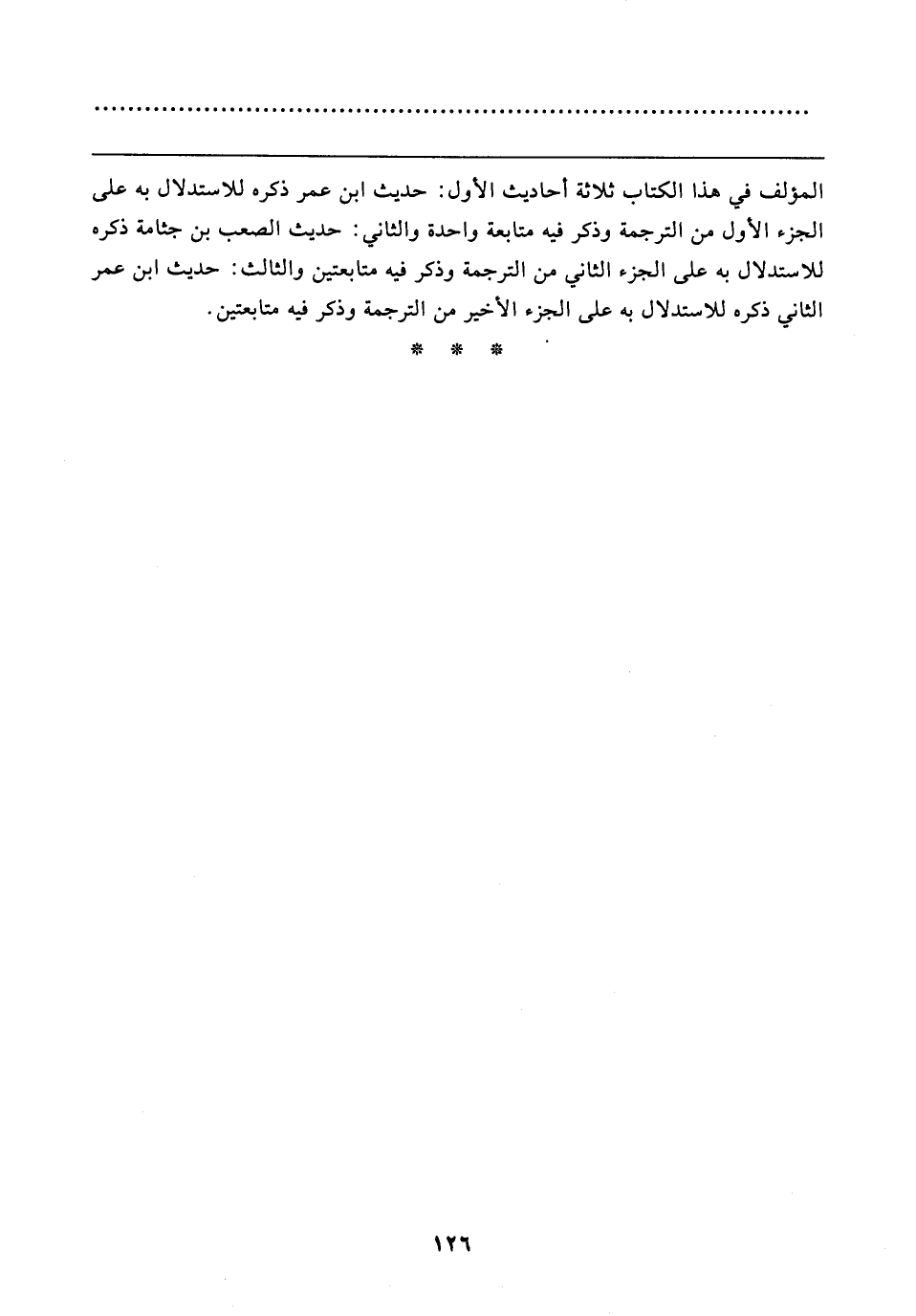 المؤلف في هذا الكتاب ثلاثة أحاديث الأول: حديث ابن عمر ذكره للاستدلال به على الجزء الأول من الترجمة وذكر فيه متابعة واحدة والثاني: حديث الصعب بن جثامة ذكره للاستدلال به على الجزء الثاني من الترجمة وذكر فيه متابعتين والثالث: حديث ابن عمر الثاني ذكره للاستدلال به على الجزء الأخير من الترجمة وذكر فيه متابعتين.