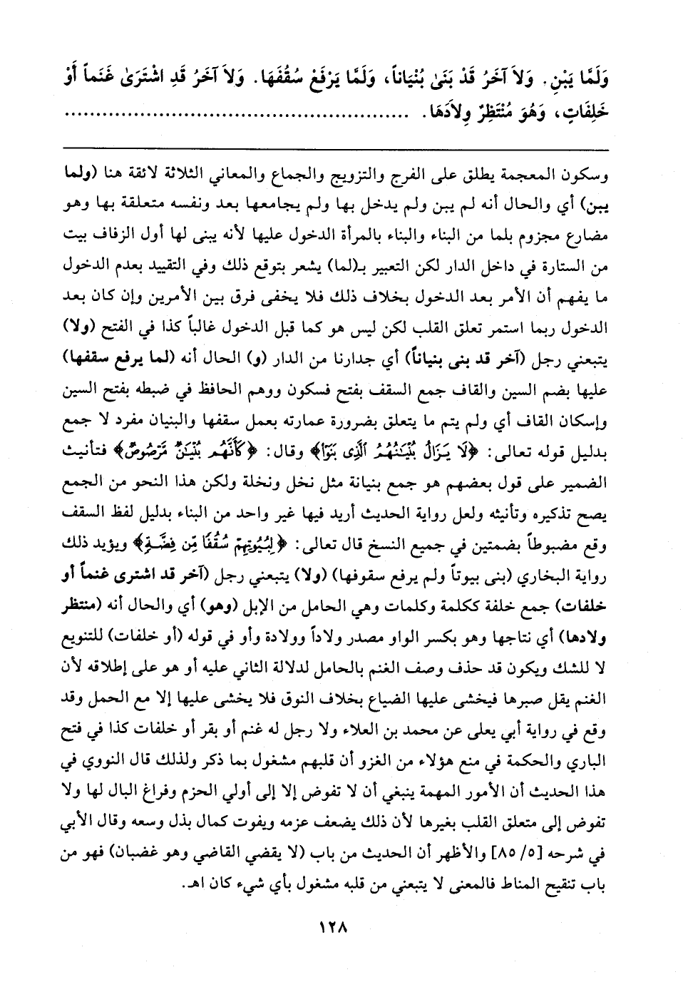 وَلَمَّا يَبْنِ. وَلَا آخَرُ قَدْ بَنَى بُنْيَانًا، وَلَمَّا يَرْفَعْ سُقُفَهَا. وَلَا آخَرُ قَدِ اشْتَرَى غَنَمًا أَوْ خَلِفَاتٍ، وَهُوَ مُنْتَظِرٌ ولادَهَا