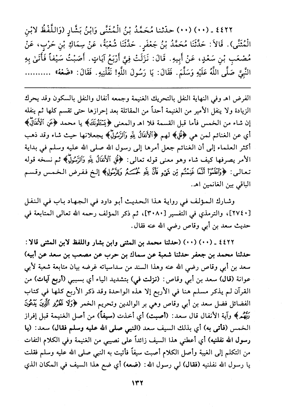 ٤٤٢٢ - (٠٠) (٠٠) حدَّثنا مُحَمَّدُ بْنُ الْمُثَنَّى وَابْنُ بَشَّارٍ (وَاللَّفْظُ لابْنِ الْمُثَنَّى). قَالا: حَدَّثَنَا مُحَمَّدُ بْنُ جَعْفَرٍ. حَدَّثَنَا شُعْبَةُ، عَنْ سِمَاكِ بْنِ حَرْبٍ، عَنْ مُصْعَبِ بْنِ سَعْدٍ، عَنْ أَبِيهِ. قَال: نَزَلَتْ فِيَّ أَرْبَعُ آيَاتٍ. أَصَبْتُ سَيفًا فَأَتَى بِهِ النَّبِيَّ صَلَّى اللهُ عَلَيهِ وَسَلَّمَ. فَقَال: يَا رَسُولَ اللهِ! نَفِّلْنِيهِ. فَقَال: "ضَعْهُ"