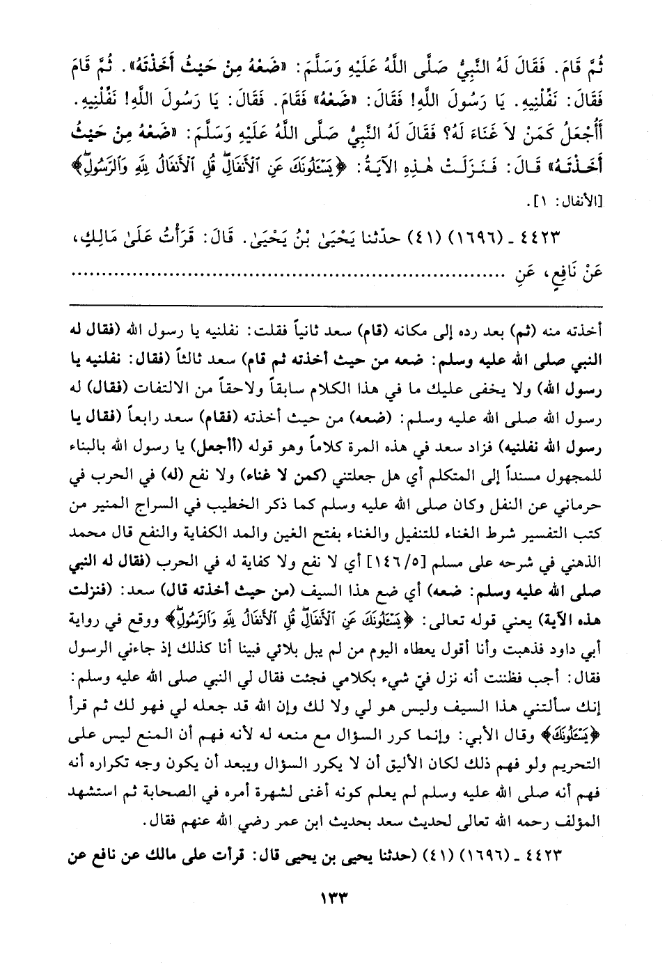 ثُمَّ قَامَ. فَقَال لَهُ النَّبِيُّ صَلَّى الله عَلَيهِ وَسَلَّمَ: "ضَعْهُ مِنْ حَيثُ أَخَذْتَهُ". ثُمَّ قَامَ فَقَال: نَفِّلْنِيهِ. يَا رَسُولَ الله! فَقَال: "ضَعْهُ" فَقَامَ. فَقَال: يَا رَسُولَ الله! نَفِّلْنِيهِ. أَأُجْعَلُ كَمَنْ لَا غَنَاءَ لَهُ؟ فَقَال لَهُ النَّبِيُّ صَلَّى الله عَلَيهِ وَسَلَّمَ: "ضَعْهُ مِنْ حَيثُ أَخَذْتَهُ" قَال: فَنَزَلَتْ هذِهِ الآيَةُ: {يَسْأَلُونَكَ عَنِ الْأَنْفَالِ قُلِ الْأَنْفَالُ لِلَّهِ وَالرَّسُولِ} [الأنفال: ١].