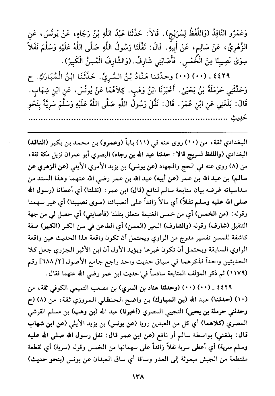 ٤٤٢٩ - (٠٠) (٠٠) (وحدثنا هناد بن السري) بن مصعب التميمي الكوفي ثقة، من (١٠) (حدثنا) عبد الله (بن المبارك) بن واضح الحنظلي المروزي ثقة، من (٨) (ح وحدثني حرملة بن يحيى) التجيبي المصري (أخبرنا) عبد الله (بن وهب) بن مسلم القرشي المصري (كلاهما) أي كل من العبدين رويا (عن يونس) بن يزيد الأيلي (عن ابن شهاب قال: بلغني) بواسطة سالم أر نافع (عن ابن عمر قال: نفل رسول الله صلى الله عليه وسلم سرية) أي أعطى سرية نفلًا زائدًا على سهمانها من الخمس وقوله (سرية) أي لقطعة مقتطعة من الجيش مبعوثة إلى العدو وساقا أي ساق العبدان عن يونس (بنحو حديث)