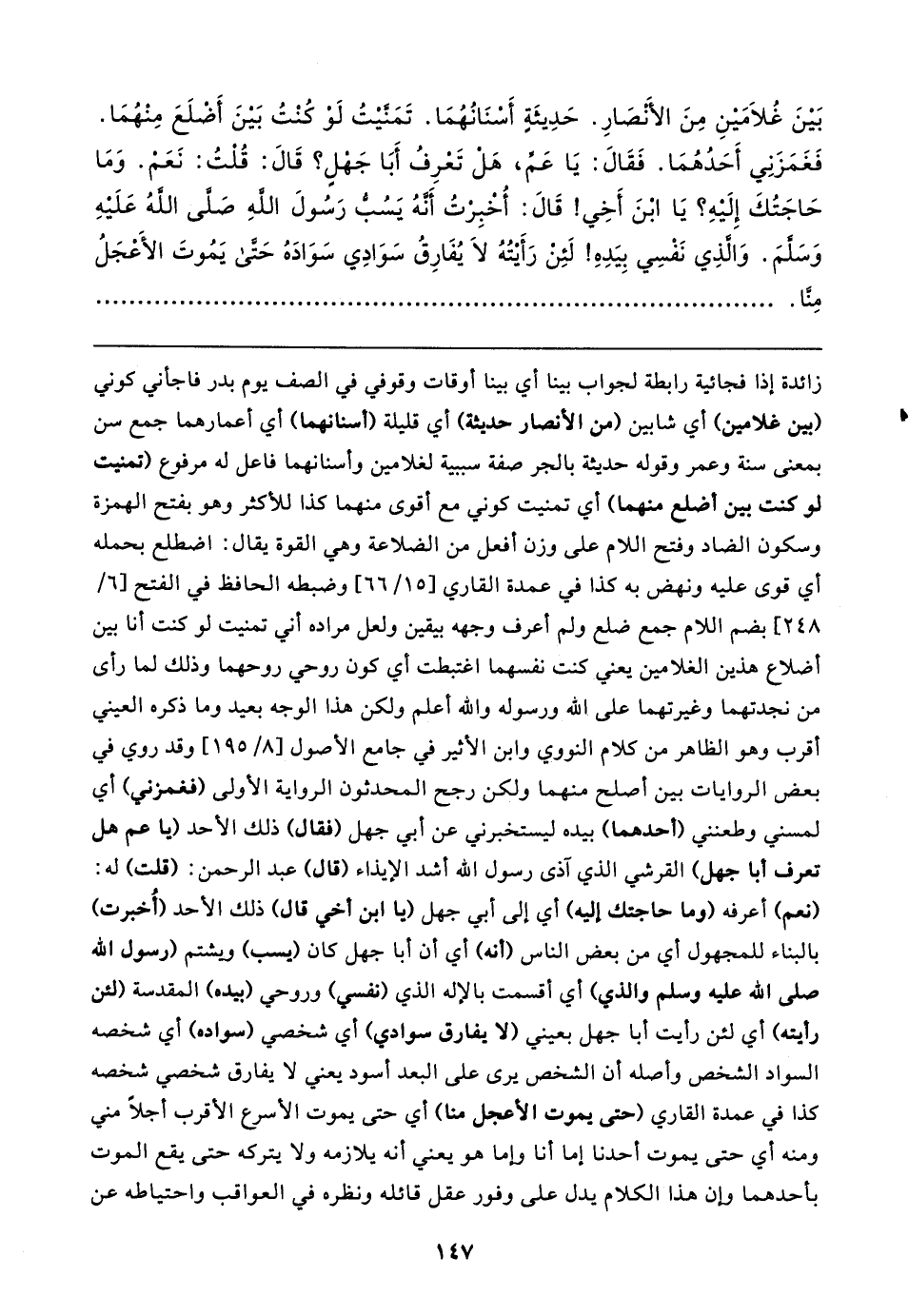 بَينَ غُلامَينِ مِنَ الأَنْصَارِ. حَدِيثَةٍ أَسْنَانُهُمَا. تَمَنَّيتُ لَوْ كُنْتُ بَينَ أَضْلَعَ مِنْهُمَا. فَغَمَزَنِي أَحَدُهُمَا. فَقَال: يَا عَمَّ، هَل تَعْرِفُ أَبَا جَهْلٍ؟ قَال: قُلْتُ: نَعَمْ. وَمَا حَاجَتُكَ إِلَيهِ؟ يَا ابْنَ أَخِي! قَال: أُخْبِرْتُ أَنَّهُ يَسُبُّ رَسُولَ الله صَلَّى الله عَلَيهِ وَسَلَّمَ. وَالَّذِي نَفْسِي بِيَدِهِ! لَئِنْ رَأَيتُهُ لَا يُفَارِقُ سَوَادِي سَوَادَهُ حَتَّى يَمُوتَ الأَعْجَلُ مِنَّا