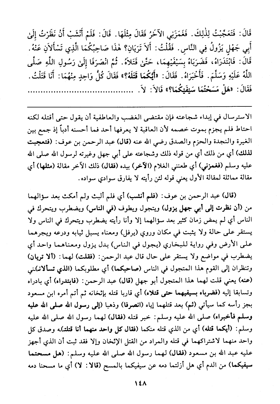 قَال: فَتَعَجَّبْتُ لِذلِكَ. فَغَمَزَنِي الآخَرُ فَقَال مِثْلَهَا. قَال: فَلَمْ أَنْشَبْ أَنْ نَظَرْتُ إِلَى أَبِي جَهْلٍ يَزُولُ فِي النَّاسِ. فَقُلْتُ: أَلا تَرَيَانِ؟ هذَا صَاحِبُكُمَا الَّذِي تَسْأَلانِ عَنْهُ. قَال: فَابْتَدَرَاهُ، فَضَرَبَاهُ بِسَيفَيهِمَا، حَتَّى قَتَلاهُ. ثُمَّ انْصَرَفَا إِلَى رَسُولِ الله صَلَّى الله عَلَيهِ وَسَلَّمَ. فَأَخْبَرَاهُ. فَقَال: "أَيُّكُمَا قَتَلَهُ؟ " فَقَال كُلُّ وَاحِدٍ مِنْهُمَا: "أَنَا قَتَلْتُ. فَقَال: "هَلْ مَسَحْتُمَا سَيفَيكُمَا؟ " قَالا: لَا