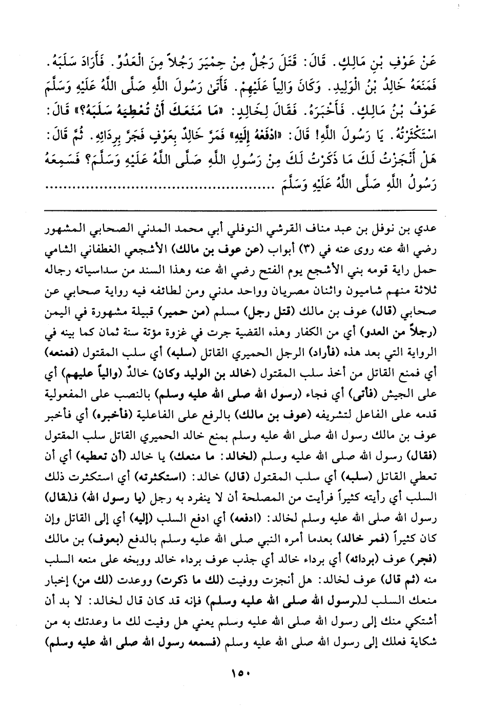 عَنْ عَوْفِ بْنِ مَالِكٍ. قَال: قَتَلَ رَجُلٌ مِنْ حِمْيَرَ رَجُلًا مِنَ الْعَدُوِّ. فَأَرَادَ سَلَبَهُ. فَمَنَعَهُ خَالِدُ بْنُ الْوَلِيدِ. وَكَانَ وَالِيًا عَلَيهِمْ. فَأَتَى رَسُولَ الله صَلَّى الله عَلَيهِ وَسَلَّمَ عَوْفُ بْنُ مَالِكٍ. فَأَخْبَرَهُ. فَقَال لِخَالِدٍ: "مَا مَنَعَكَ أَنْ تُعْطِيَهُ سَلَبَهُ؟ " قَال: اسْتَكْثَرْتُهُ. يَا رَسُولَ اللهِ! قَال: "ادْفَعْهُ إِلَيهِ" فَمَرَّ خَالِدٌ بِعَوْفٍ فَجَرَّ بِرِدَائِهِ. ثُمَّ قَال: هَلْ أَنْجَزْتُ لَكَ مَا ذَكَرْتُ لَكَ مِنْ رَسُولِ الله صَلَّى الله عَلَيهِ وَسَلَّمَ؟ فَسَمِعَهُ رَسُولُ الله صَلَّى الله عَلَيهِ وَسَلَّمَ