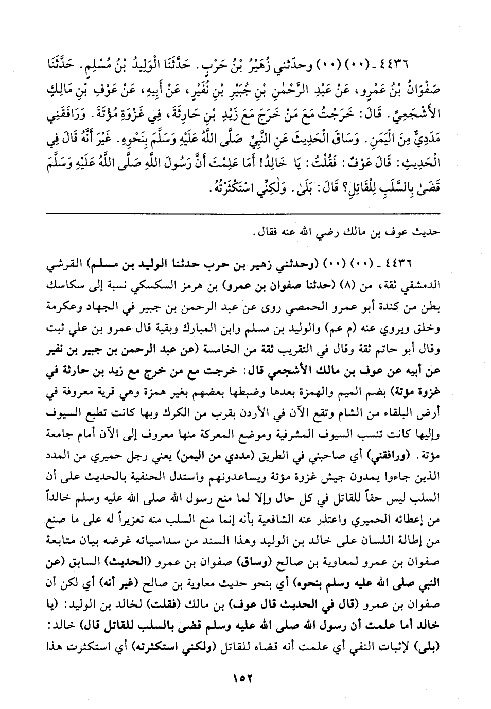 ٤٤٣٦ - (٠٠) (٠٠) وحدّثني زُهَيرُ بْنُ حَرْبٍ. حَدَّثَنَا الْوَلِيدُ بْنُ مُسْلِمٍ. حَدَّثَنَا صَفْوَانُ بْنُ عَمْرٍو، عَنْ عَبْدِ الرَّحْمنِ بْنِ جُبَيرِ بْنِ نُفَيرٍ، عَنْ أَبِيهِ، عَنْ عَوْفِ بْنِ مَالِكٍ الأَشْجَعِيِّ. قَال: خَرَجْتُ مَعَ مَنْ خَرَجَ مَعَ زَيدِ بْنِ حَارِثَةَ، فِي غَزْوَةِ مُؤْتَةَ. وَرَافَقَنِي مَدَدِيٌّ مِنَ الْيَمَنِ. وَسَاقَ الْحَدِيثَ عَنِ النَّبِيِّ صَلَّى اللَّهُ عَلَيهِ وَسَلَّمَ بِنَحْوهِ. غَيرَ أَنَّهُ قَال فِي الْحَدِيثِ: قَال عَوْفٌ: فَقُلْتُ: يَا خَالِدُ! أَمَا عَلِمْتَ أَنَّ رَسُولَ اللهِ صَلَّى اللهُ عَلَيهِ وَسَلَّمَ قَضَى بِالسَّلَبِ لِلْقَاتِلِ؟ قَال: بَلَى. وَلكِنِّي اسْتَكْثَرْتُهُ