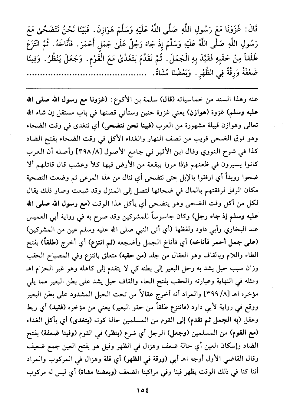 قَال: غَزَوْنَا مَعَ رَسُولِ الله صَلَّى اللهُ عَلَيهِ وَسَلَّمَ هَوَازِنَ. فَبَينَا نَحْنُ نَتَضَحَّى مَعَ رَسُولِ الله صَلَّى الله عَلَيهِ وَسَلَّمَ إِذ جَاءَ رَجُلٌ عَلَى جَمَلٍ أَحْمَرَ. فَأَنَاخَهُ. ثُمَّ انْتَزَعَ طَلَقًا مِنْ حَقَبِهِ فَقَيَّدَ بِهِ الْجَمَلَ. ثُمَّ تَقَدَّمَ يَتَغَدَّى مَعَ الْقَوْمِ. وَجَعَلَ يَنْظُرُ. وَفِينَا ضَعْفَةٌ وَرِقَّةٌ فِي الظَّهْرِ. وَبَعْضُنَا مُشَاةٌ