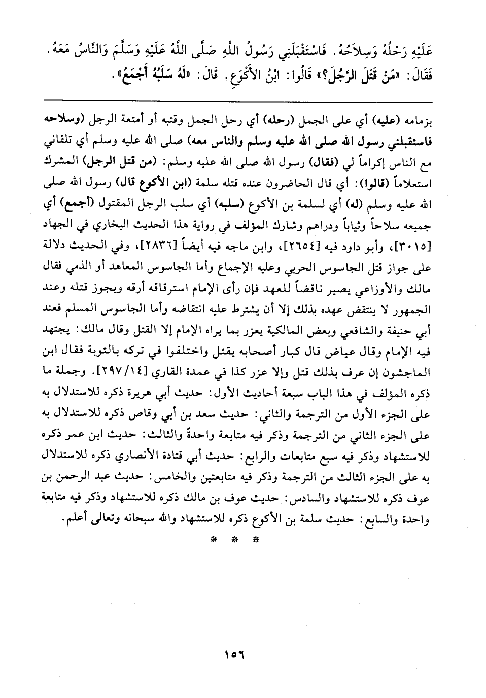 بزمامه (عليه) أي على الجمل (رحله) أي رحل الجمل وقتبه أو أمتعة الرجل (وسلاحه فاستقبلني رسول الله صلى الله عليه وسلم والناس معه) صلى الله عليه وسلم أي تلقاني مع الناس إكرامًا لي (فقال) رسول الله صلى الله عليه وسلم: (من قتل الرجل) المشرك استعلامًا (قالوا): أي قال الحاضرون عنده قتله سلمة (ابن الأكوع قال) رسول الله صلى الله عليه وسلم (له) أي لسلمة بن الأكوع (سلبه) أي سلب الرجل المقتول (أجمع) أي جميعه سلاحًا وثيابًا ودراهم وشارك المؤلف في رواية هذا الحديث البخاري في الجهاد [٣٠١٥]، وأبو داود فيه [٢٦٥٤]، وابن ماجه فيه أيضًا [٢٨٣٦]، وفي الحديث دلالة على جواز قتل الجاسوس الحربي وعليه الإجماع وأما الجاسوس المعاهد أو الذمي فقال مالك والأوزاعي يصير ناقضًا للعهد فإن رأى الإمام استرقاقه أرقه ويجوز قتله وعند الجمهور لا ينتقض عهده بذلك إلا أن يشترط عليه انتقاضه وأما الجاسوس المسلم فعند أبي حنيفة والشافعي وبعض المالكية يعزر بما يراه الإمام إلا القتل وقال مالك: يجتهد فيه الإمام وقال عياض قال كبار أصحابه يقتل واختلفوا في تركه بالتوبة فقال ابن الماجشون إن عرف بذلك قتل وإلا عزر كذا في عمدة القاري [١٤/ ٢٩٧]. وجملة ما ذكره المؤلف في هذا الباب صبعة أحاديث الأول: حديث أبي هريرة ذكره للاستدلال به على الجزء الأول من الترجمة والثاني: حديث سعد بن أبي وقاص ذكره للاستدلال به على الجزء الثاني من الترجمة وذكر فيه متابعة واحدةً والثالث: حديث ابن عمر ذكره للاستشهاد وذكر فيه سبع متابعات والرابع: حديث أبي قتادة الأنصاري ذكره للاستدلال به على الجزء الثالث من الترجمة وذكر فيه متابعتين والخامس: حديث عبد الرحمن بن عوف ذكره للاستشهاد والسادس: حديث عوف بن مالك ذكره للاستشهاد وذكر فيه متابعة واحدة والسابع: حديث سلمة بن الأكوع ذكره للاستشهاد والله سبحانه وتعالى أعلم.