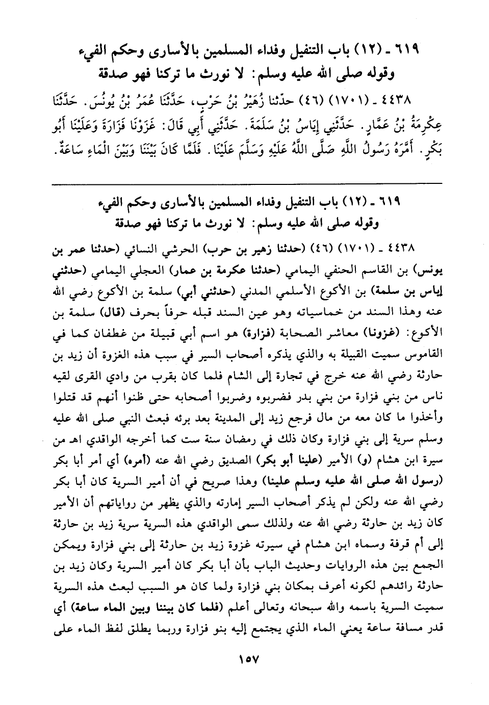 ٤٤٣٨ - (١٧٠١) (٤٦) (حدثنا زهير بن حرب) الحرشي النسائي (حدثنا عمر بن يونس) بن القاسم الحنفي اليمامي (حدثنا عكرمة بن عمار) العجلي اليمامي (حدثني إياس بن سلمة) بن الأكوع الأسلمي المدني (حدثني أبي) سلمة بن الأكوع رضي الله عنه وهذا السند من خماسياته وهو عين السند قبله حرفًا بحرف (قال) سلمة بن الأكوع: (غزونا) معاشر الصحابة (فزارة) هو اسم أبي قبيلة من غطفان كما في القاموس سميت القبيلة به والذي يذكره أصحاب السير في سبب هذه الغزوة أن زيد بن حارثة رضي الله عنه خرج في تجارة إلى الشام فلما كان بقرب من وادي القرى لقيه ناس من بني فزارة من بني بدر فضربوه وضربوا أصحابه حتى ظنوا أنهم قد قتلوا وأخذوا ما كان معه من مال فرجع زيد إلى المدينة بعد برئه فبعث النبي صلى الله عليه وسلم سرية إلى بني فزارة وكان ذلك في رمضان سنة ست كما أخرجه الواقدي اهـ من سيرة ابن هشام (و) الأمير (علينا أبو بكر) الصديق رضي الله عنه (أمره) أي أمر أبا بكر (رسول الله صلى الله عليه وسلم علينا) وهذا صريح في أن أمير السرية كان أبا بكر رضي الله عنه ولكن لم يذكر أصحاب السير إمارته والذي يظهر من رواياتهم أن الأمير كان زيد بن حارثة رضي الله عنه ولذلك سمى الواقدي هذه السرية سرية زيد بن حارثة إلى أم قرفة وسماه ابن هشام في سيرته غزوة زيد بن حارثة إلى بني فزارة ويمكن الجمع بين هذه الروايات وحديث الباب بان أبا بكر كان أمير السرية وكان زيد بن حارثة رائدهم لكونه أعرف بمكان بني فزارة ولما كان هو السبب لبعث هذه السرية سميت السرية باسمه والله سبحانه وتعالى أعلم (فلما كان بيننا وبين الماء ساعة) أي قدر مسافة ساعة يعني الماء الذي يجتمع إليه بنو فزارة وربما يطلق لفظ الماء على