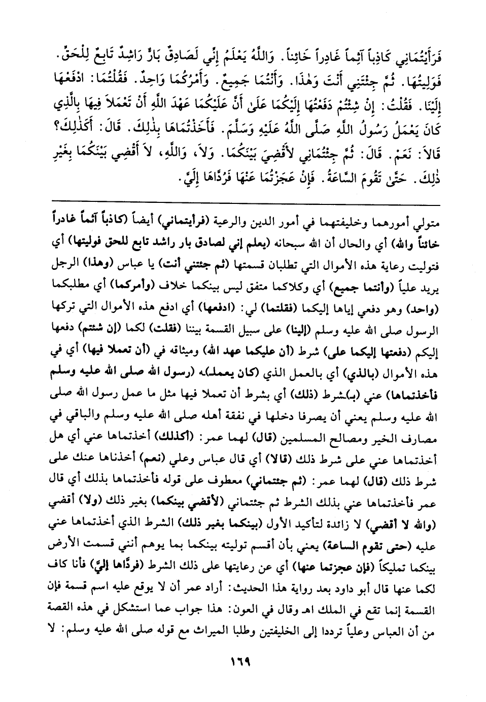 فَرَأَيتُمَانِي كَاذِبًا آثِمًا غَادِرًا خَائِنًا. وَاللهُ يَعْلَمُ إِنِّي لَصَادِقٌ بَارٌ رَاشِدٌ تَابعٌ لِلْحَقِّ. فَوَلِيتُهَا. ثُمَّ جِئْتَنِي أَنْتَ وَهذَا. وَأَنْتُمَا جَمِيعٌ. وَأَمْرُكُمَا وَاحِدٌ. فَقُلْتُمَا: ادْفَعْهَا إِلَينَا. فَقُلْتُ: إِنْ شِئتُمْ دَفَعْتُهَا إِلَيكُمَا عَلَى أَنَّ عَلَيكُمَا عَهْدَ اللهِ أَنْ تَعْمَلا فِيهَا بالَّذِي كَانَ يَعْمَلُ رَسُولُ اللهِ صَلَّى اللهُ عَلَيهِ وَسَلَّمَ. فَأَخَذتُمَاهَا بِذلِكَ. قَال: أَكَذلِكَ؟ قَالا: نَعَمْ. قَال: ثُمَّ جِئتُمَانِي لأَقْضِيَ بَينَكُمَا. وَلَا، وَاللهِ، لَا أَقْضِي بَينَكُمَا بِغَيرِ ذلِكَ. حَتَّى تَقُومَ السَّاعَةُ. فَإِنْ عَجَزتُمَا عَنْهَا فَرُدَّاهَا إِلَيَّ
